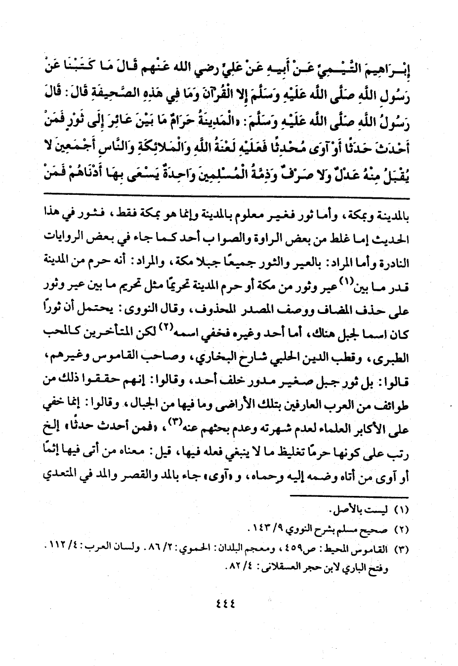 إِبْرَاهِيمَ التَّيْمِيِّ، عَنْ أَبِيهِ، عَنْ عَلِيٍّ رَضِيَ اللَّهُ عَنْهُ، قَالَ: مَا كَتَبْنَا عَنْ رَسُولِ اللَّهِ صَلَّى اللهُ عَلَيْهِ وَسَلَّمَ إِلَّا الْقُرْآنَ وَمَا فِي هَذِهِ الصَّحِيفَةِ قَالَ: قَالَ رَسُولُ اللَّهِ صَلَّى اللهُ عَلَيْهِ وَسَلَّمَ: «الْمَدِينَةُ حَرَامٌ مَا بَيْنَ عَائِرَ إِلَى ثَوْرٍ فَمَنْ أَحْدَثَ حَدَثًا أَوْ آوَى مُحْدِثًا، فَعَلَيْهِ لَعْنَةُ اللَّهِ وَالْمَلَائِكَةِ وَالنَّاسِ أَجْمَعِينَ، لَا يُقْبَلُ مِنْهُ عَدْلٌ وَلَا صَرْفٌ، وَذِمَّةُ الْمُسْلِمِينَ وَاحِدَةٌ يَسْعَى بِهَا أَدْنَاهُمْ فَمَنْ