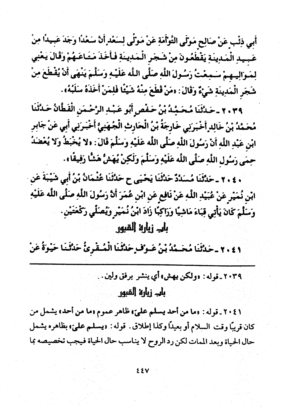 2039 - حَدَّثَنَا مُحَمَّدُ بْنُ حَفْصٍ أَبُو عَبْدِ الرَّحْمَنِ الْقَطَّانُ، حَدَّثَنَا مُحَمَّدُ بْنُ خَالِدٍ، أَخْبَرَنِي خَارِجَةُ بْنُ الْحَارِثِ الْجُهَنِيُّ، أَخْبَرَنِي أَبِي، عَنْ جَابِرِ بْنِ عَبْدِ اللَّهِ، أَنْ رَسُولَ اللَّهِ صَلَّى اللهُ عَلَيْهِ وَسَلَّمَ قَالَ: «لَا يُخْبَطُ وَلَا يُعْضَدُ حِمَى رَسُولِ اللَّهِ صَلَّى اللهُ عَلَيْهِ وَسَلَّمَ، وَلَكِنْ يُهَشُّ هَشًّا رَفِيقًا».