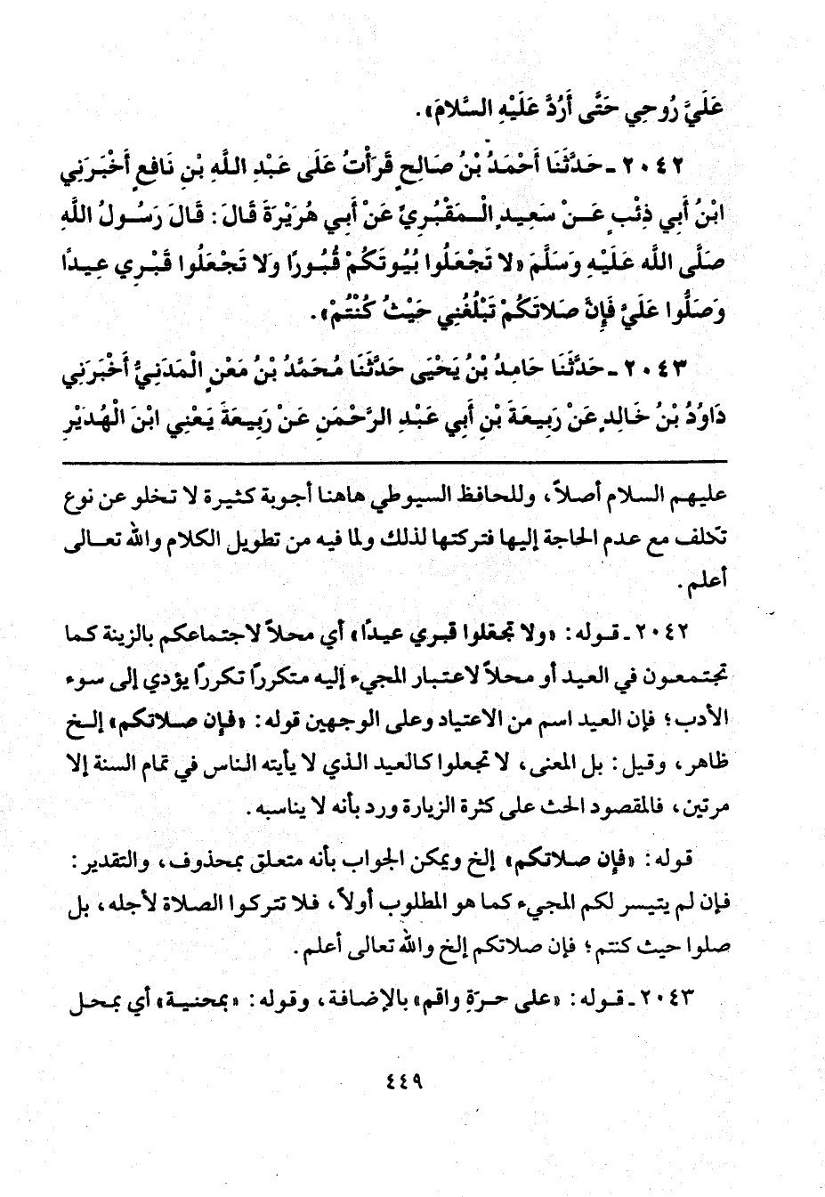 2042 - قوله: "ولا تجعلوا قبري عيدًا" أي محلًا لاجتماعكم بالزينة كما تجتمعون في العيد أو محلًا لاعتبار المجيء إليه متكررًا تكررًا يؤدي إلى سوء الأدب، فإن العيد اسم من الاعتياد وعلى الوجهين قوله: "فإن صلاتكم" إلخ ظاهر، وقيل: بل المعنى، لا تجعلوا كالعيد الذي لا يأتيه الناس في تمام السنة إلا مرتين، فالمقصود الحث على كثرة الزيارة ورد بأنه لا يناسبه.