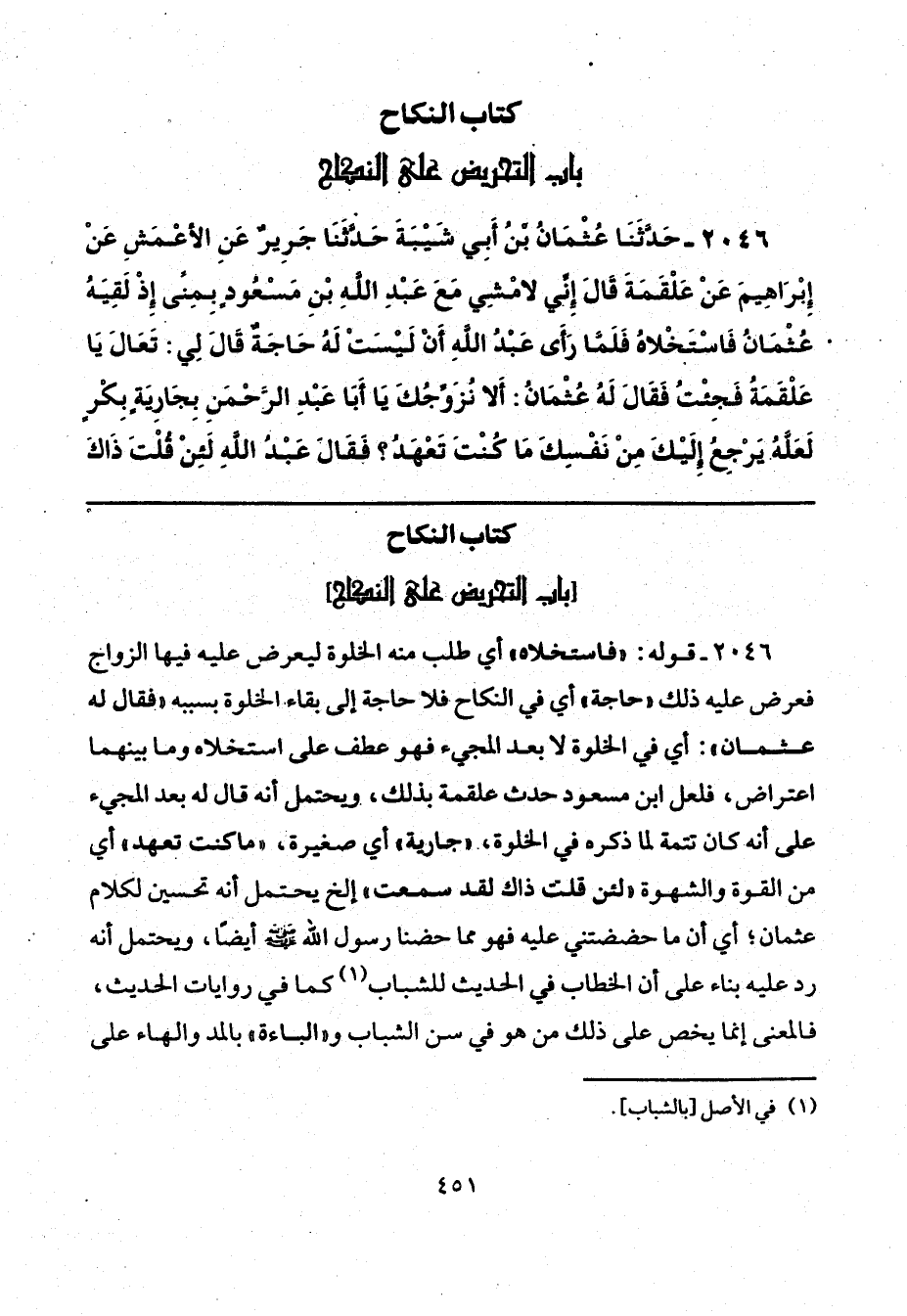 2046 - قوله: "فاستخلاه" أي طلب منه الخلوة ليعرض عليه فيها الزواج فعرض عليه ذلك "حاجة" أي في النكاح فلا حاجة إلى بقاء الخلوة بسببه "فقال له عثمان": أي في الخلوة لا بعد المجيء فهو عطف على استخلاه وما بينهما اعتراض، فلعل ابن مسعود حدث علقمة بذلك، ويحتمل أنه قال له بعد المجيء على أنه كان تتمة لما ذكره في الخلوة، "جارية" أي صغيرة، "ما كنت تعهد" أي من القوة والشهوة "لئن قلت ذاك لقد سمعت" إلخ يحتمل أنه تحسين لكلام عثمان، أي أن ما حضضتني عليه فهو مما حضنا رسول الله - صلى الله عليه وسلم - أيضًا، ويحتمل أنه رد عليه بناء على أن الخطاب في الحديث للشباب (¬1) كما في روايات الحديث، فالمعنى إنما يخص على ذلك من هو في سن الشباب و"الباءة" بالمد والهاء على
