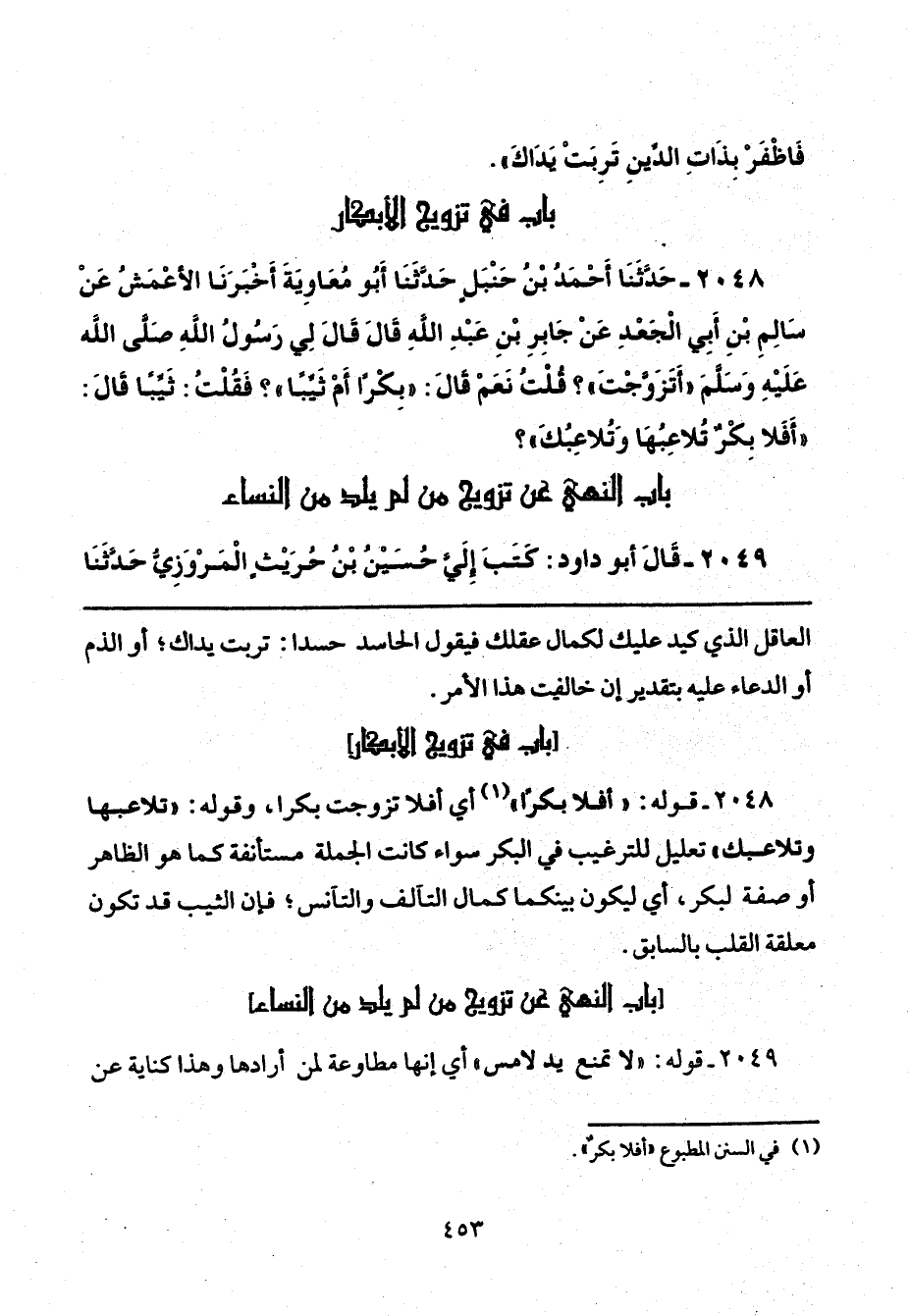 2048 - قوله: "أفلا بكرًا" (¬1) أي أفلا تزوجت بكرًا، وقوله: "تلاعبها وتلاعبك" تعليل للترغيب في البكر سواء كانت الجملة مستأنفة كما هو الظاهر أو صفة لبكر، أي ليكون بينكما كمال التآلف والتآنس؛ فإن الثيب قد تكون معلقة القلب بالسابق.