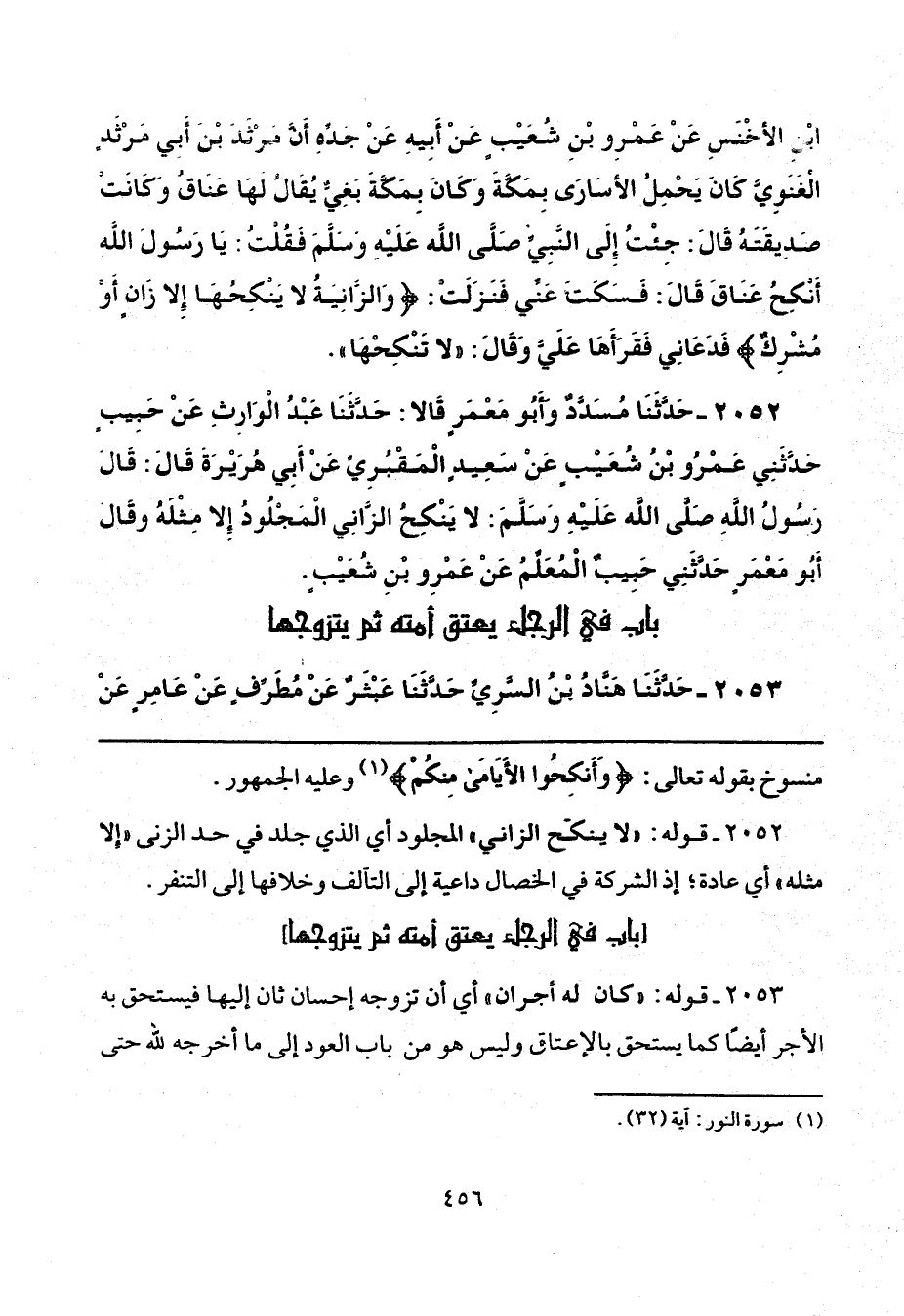 2052 - حَدَّثَنَا مُسَدَّدٌ، وَأَبُو مَعْمَرٍ، قَالَا: حَدَّثَنَا عَبْدُ الْوَارِثِ، عَنْ حَبِيبٍ، حَدَّثَنِي عَمْرُو بْنُ شُعَيْبٍ، عَنْ سَعِيدٍ الْمَقْبُرِيِّ، عَنْ أَبِي هُرَيْرَةَ، قَالَ: قَالَ رَسُولُ اللَّهِ صَلَّى اللهُ عَلَيْهِ وَسَلَّمَ: «لَا يَنْكِحُ الزَّانِي الْمَجْلُودُ إِلَّا مِثْلَهُ». وَقَالَ أَبُو مَعْمَرٍ حَدَّثَنِي حَبِيبٌ الْمُعَلِّمُ، عَنْ عَمْرِو بْنِ شُعَيْبٍ.