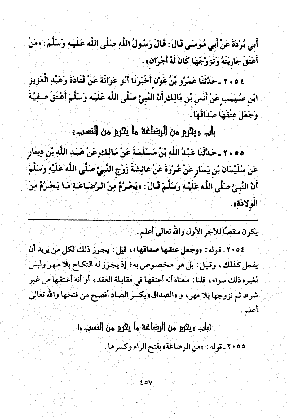 2054 - قوله: "وجعل عتقها صداقها"، قيل: يجوز ذلك لكل من يريد أن يفعل كذلك، وقيل: بل هو مخصوص به، إذ يجوز له النكاح بلا مهر وليس لغيره ذلك سواء، قلنا: معناه أنه أعتقها في مقابلة العقد، أو أنه أعتقها من غير شرط ثم تزوجها بلا مهر، و"الصداق" بكسر الصاد أفصح من فتحها والله تعالى أعلم.