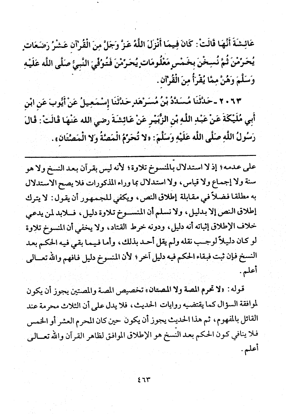 2063 - حَدَّثَنَا مُسَدَّدُ بْنُ مُسَرْهَدٍ، حَدَّثَنَا إِسْمَاعِيلُ، عَنْ أَيُّوبَ، عَنِ ابْنِ أَبِي مُلَيْكَةَ، عَنْ عَبْدِ اللَّهِ بْنِ الزُّبَيْرِ، عَنْ عَائِشَةَ رَضِيَ اللَّهُ عَنْهَا، قَالَتْ: قَالَ رَسُولُ اللَّهِ صَلَّى اللهُ عَلَيْهِ وَسَلَّمَ: «لَا تُحَرِّمُ الْمَصَّةُ وَلَا الْمَصَّتَانِ».