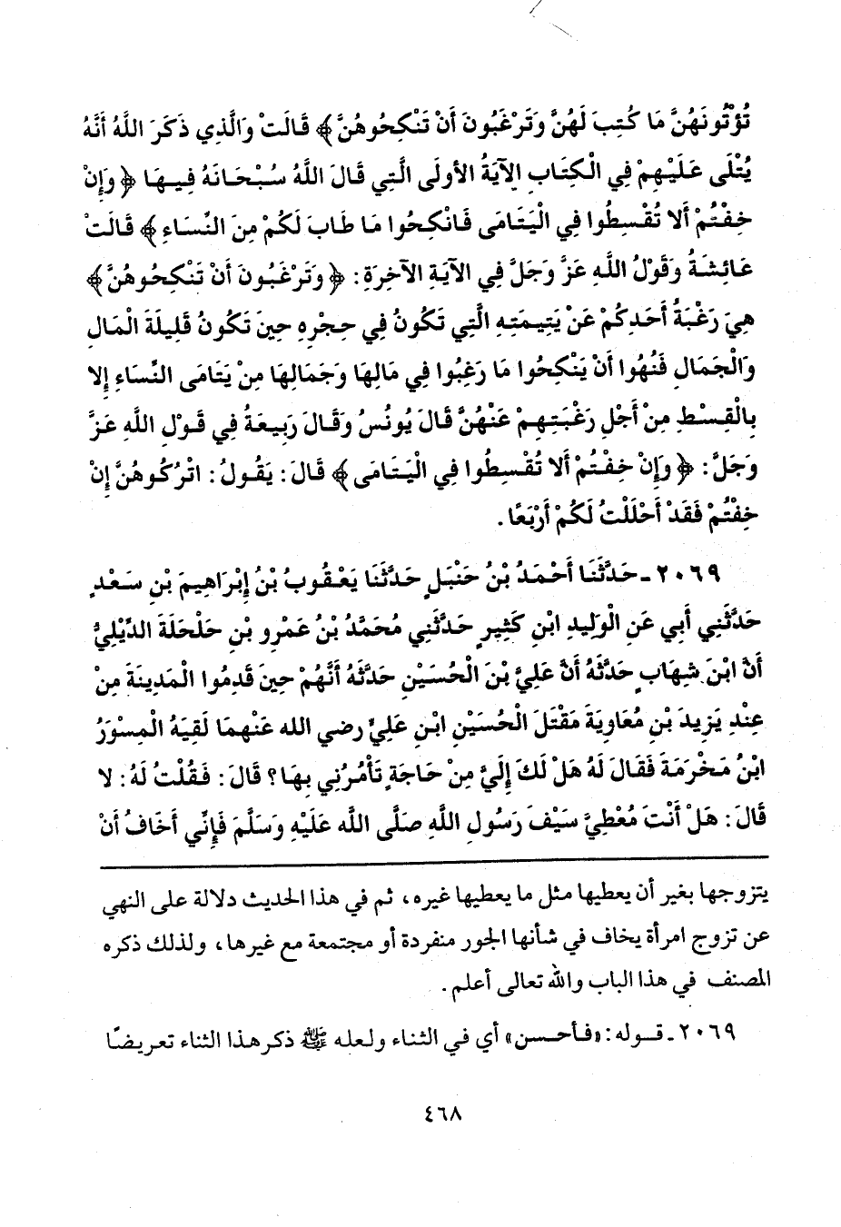 2069 - حَدَّثَنَا أَحْمَدُ بْنُ حَنْبَلٍ، حَدَّثَنَا يَعْقُوبُ بْنُ إِبْرَاهِيمَ بْنِ سَعْدٍ، حَدَّثَنِي أَبِي، عَنِ الْوَلِيدِ بْنِ كَثِيرٍ، حَدَّثَنِي مُحَمَّدُ بْنُ عَمْرِو بْنِ حَلْحَلَةَ الدِّيْلِيُّ، أَنَّ ابْنَ شِهَابٍ، حَدَّثَهُ، أَنَّ عَلِيَّ بْنَ الْحُسَيْنِ حَدَّثَهُ أَنَّهُمْ حِينَ قَدِمُوا الْمَدِينَةَ مِنْ عِنْدِ يَزِيدَ بْنِ مُعَاوِيَةَ مَقْتَلَ الْحُسَيْنِ بْنِ عَلِيٍّ رَضِيَ اللَّهُ عَنْهُمَا، لَقِيَهُ الْمِسْوَرُ بْنُ مَخْرَمَةَ، فَقَالَ لَهُ: هَلْ لَكَ إِلَيَّ مِنْ حَاجَةٍ تَأْمُرُنِي بِهَا، قَالَ: فَقُلْتُ لَهُ: لَا، قَالَ: هَلْ أَنْتَ مُعْطِيَّ سَيْفَ رَسُولِ اللَّهِ صَلَّى اللهُ عَلَيْهِ وَسَلَّمَ فَإِنِّي أَخَافُ أَنْ