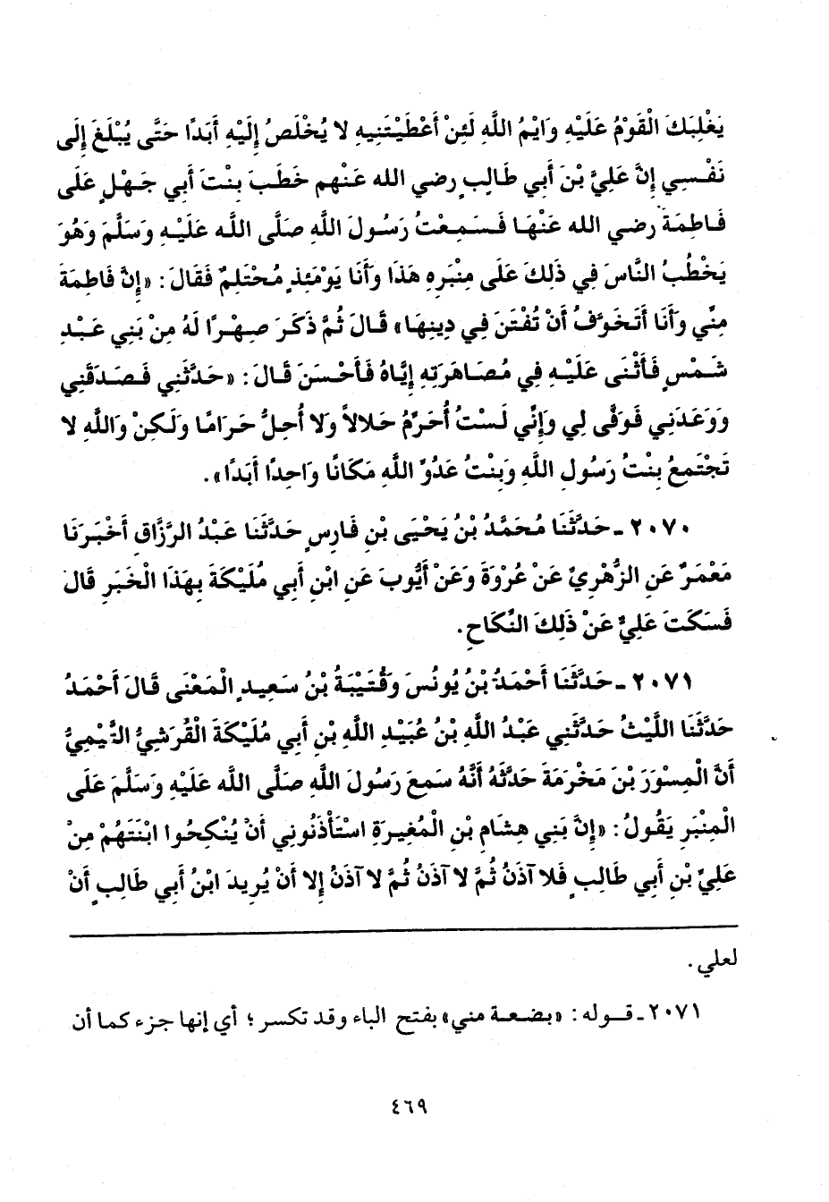 2071 - حَدَّثَنَا أَحْمَدُ بْنُ يُونُسَ، وَقُتَيْبَةُ بْنُ سَعِيدٍ الْمَعْنَى - قَالَ أَحْمَدُ - حَدَّثَنَا اللَّيْثُ، حَدَّثَنِي عَبْدُ اللَّهِ بْنُ عُبَيْدِ اللَّهِ بْنِ أَبِي مُلَيْكَةَ الْقُرَشِيُّ التَّيْمِيُّ، أَنَّ الْمِسْوَرَ بْنَ مَخْرَمَةَ، حَدَّثَهُ، أَنَّهُ سَمِعَ رَسُولَ اللَّهِ صَلَّى اللهُ عَلَيْهِ وَسَلَّمَ عَلَى الْمِنْبَرِ يَقُولُ: «إِنَّ بَنِي هِشَامِ بْنِ الْمُغِيرَةِ اسْتَأْذَنُونِي أَنْ يُنْكِحُوا ابْنَتَهُمْ مِنْ عَلِيِّ بْنِ أَبِي طَالِبٍ فَلَا آذَنُ، - ثُمَّ لَا آذَنُ -، ثُمَّ لَا آذَنُ إِلَّا أَنْ يُرِيدَ ابْنُ أَبِي طَالِبٍ أَنْ