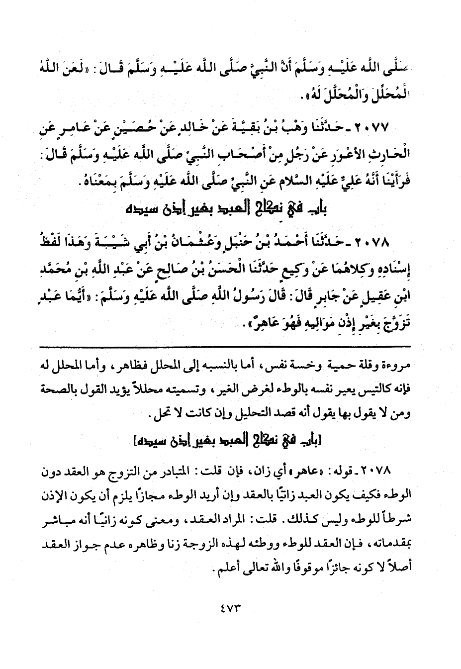 2078 - حَدَّثَنَا أَحْمَدُ بْنُ حَنْبَلٍ، وَعُثْمَانُ بْنُ أَبِي شَيْبَةَ، وَهَذَا لَفْظُ إِسْنَادِهِ، وَكِلَاهُمَا، عَنْ وَكِيعٍ، حَدَّثَنَا الْحَسَنُ بْنُ صَالِحٍ، عَنْ عَبْدِ اللَّهِ بْنِ مُحَمَّدِ بْنِ عَقِيلٍ، عَنْ جَابِرٍ، قَالَ: قَالَ رَسُولُ اللَّهِ صَلَّى اللهُ عَلَيْهِ وَسَلَّمَ: «أَيُّمَا عَبْدٍ تَزَوَّجَ بِغَيْرِ إِذْنِ مَوَالِيهِ، فَهُوَ عَاهِرٌ».