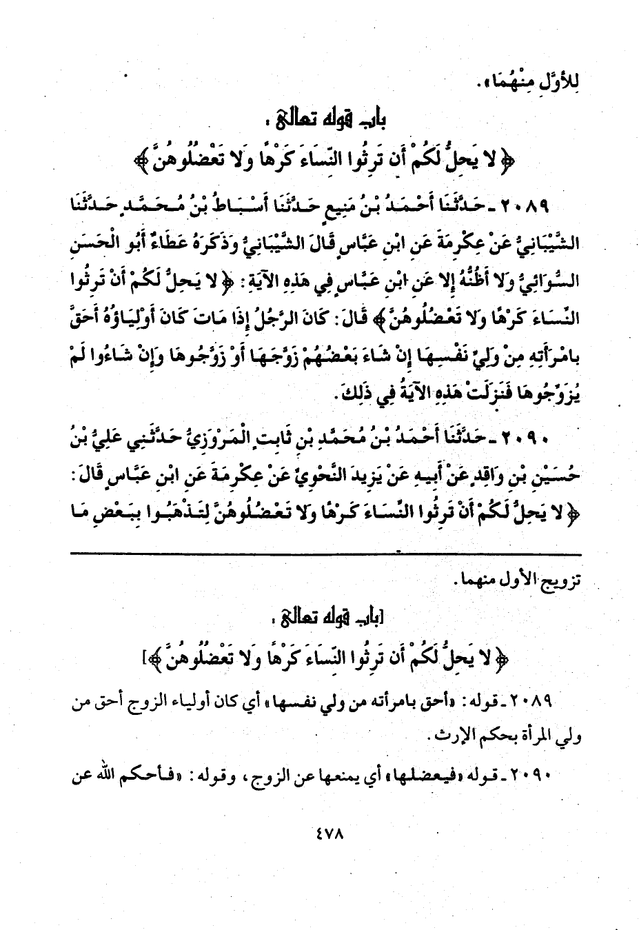 2090 - حَدَّثَنَا أَحْمَدُ بْنُ مُحَمَّدِ بْنِ ثَابِتٍ الْمَرْوَزِيُّ، حَدَّثَنِي عَلِيُّ بْنُ حُسَيْنِ بْنِ وَاقِدٍ، عَنْ أَبِيهِ، عَنْ يَزِيدَ النَّحْوِيِّ، عَنْ عِكْرِمَةَ، عَنِ ابْنِ عَبَّاسٍ، قَالَ: {لَا يَحِلُّ لَكُمْ أَنْ تَرِثُوا النِّسَاءَ كَرْهًا وَلَا تَعْضُلُوهُنَّ لِتَذْهَبُوا بِبَعْضِ مَا