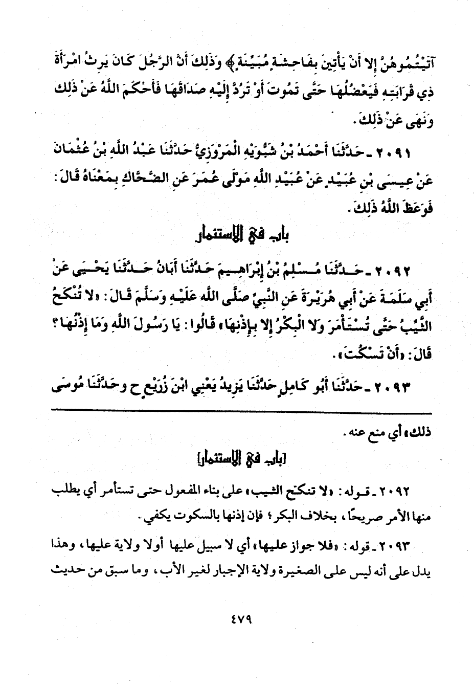 2092 - قوله: "لا تنكح الثيب" على بناء المفعول حتى تستأمر أي يطلب منها الأمر صريحًا، بخلاف البكر، فإن إذنها بالسكوت يكفي.