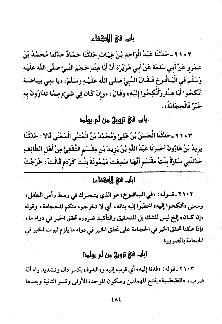 2102 - قوله: "في اليافوخ" هو الذي يتحرك في وسط رأس الطفل، ومعنى "أنكحوا إليه" اخطبوا إليه بناته، أي لا تخرجوه منكم للحجامة، وقوله "إن كان" إلخ ليس للشك بل للتحقيق والتأكيد ضروره تحقق الخير في دواء ما، فإذا علقنا تحقق الخير في الحجامة على تحقق الخير في دواء ما يلزم ثبوت الخير في الحجامة بالضرورة.