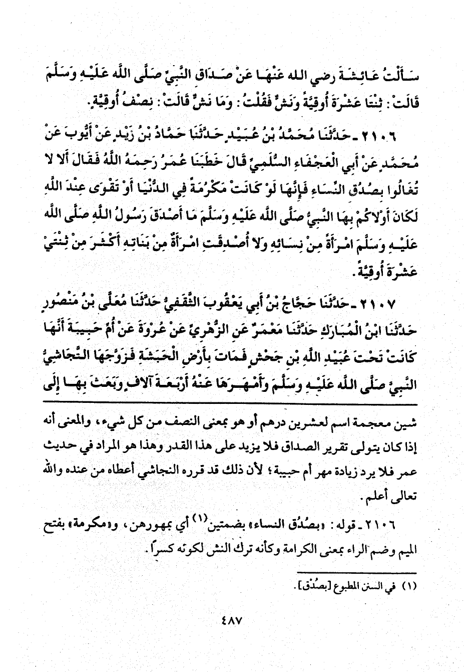 2106 - قوله: "بصُدُق النساء" بضمتين (¬1) أي بمهورهن، و"مكرمة" بفتح الميم وضم الراء بمعنى الكرامة وكأنه ترك النش لكونه كسرًا.