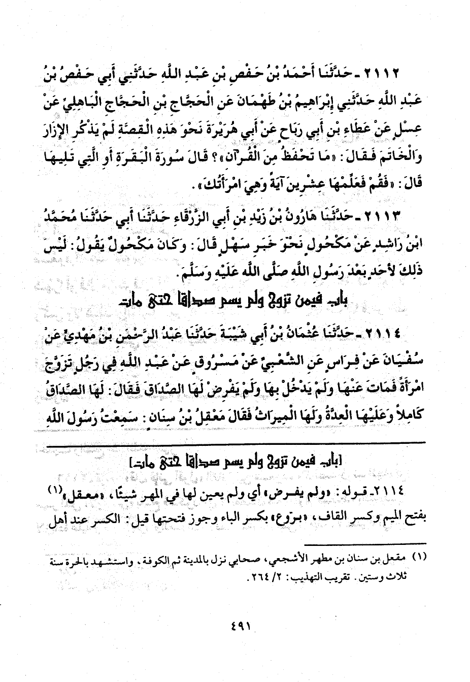 2114 - حَدَّثَنَا عُثْمَانُ بْنُ أَبِي شَيْبَةَ، حَدَّثَنَا عَبْدُ الرَّحْمَنِ بْنُ مَهْدِيٍّ، عَنْ سُفْيَانَ، عَنْ فِرَاسٍ، عَنِ الشَّعْبِيِّ، عَنْ مَسْرُوقٍ، عَنْ عَبْدِ اللَّهِ، فِي رَجُلٍ تَزَوَّجَ امْرَأَةً فَمَاتَ عَنْهَا، وَلَمْ يَدْخُلْ بِهَا وَلَمْ يَفْرِضْ لَهَا الصَّدَاقَ، فَقَالَ: لَهَا الصَّدَاقُ كَامِلًا، وَعَلَيْهَا الْعِدَّةُ، وَلَهَا الْمِيرَاثُ، فَقَالَ مَعْقِلُ بْنُ سِنَانٍ: سَمِعْتُ رَسُولَ اللَّهِ