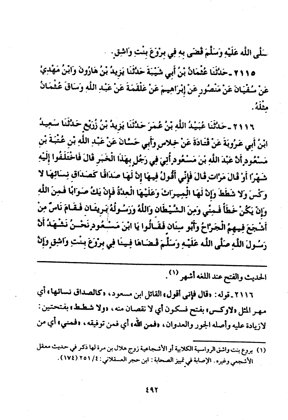 2116 - حَدَّثَنَا عُبَيْدُ اللَّهِ بْنُ عُمَرَ، حَدَّثَنَا يَزِيدُ بْنُ زُرَيْعٍ، حَدَّثَنَا سَعِيدُ بْنُ أَبِي عَرُوبَةَ، عَنْ قَتَادَةَ، عَنْ خِلَاسٍ، وَأَبِي حَسَّانَ، عَنْ عَبْدِ اللَّهِ بْنِ عُتْبَةَ بْنِ مَسْعُودٍ، أَنَّ عَبْدَ اللَّهِ بْنَ مَسْعُودٍ، أُتِيَ فِي رَجُلٍ بِهَذَا الْخَبَرِ، قَالَ: فَاخْتَلَفُوا إِلَيْهِ، شَهْرًا - أَوْ قَالَ: - مَرَّاتٍ، قَالَ: فَإِنِّي أَقُولُ فِيهَا إِنَّ لَهَا صَدَاقًا كَصَدَاقِ نِسَائِهَا، لَا وَكْسَ، وَلَا شَطَطَ، وَإِنَّ لَهَا الْمِيرَاثَ وَعَلَيْهَا الْعِدَّةُ، فَإِنْ يَكُ صَوَابًا، فَمِنَ اللَّهِ وَإِنْ يَكُنْ خَطَأً فَمِنِّي وَمِنَ الشَّيْطَانِ، وَاللَّهُ وَرَسُولُهُ بَرِيئَانِ، فَقَامَ نَاسٌ مِنْ أَشْجَعَ فِيهِمُ الْجَرَّاحُ، وَأَبُو سِنَانٍ فَقَالُوا: يَا ابْنَ مَسْعُودٍ نَحْنُ نَشْهَدُ أَنَّ رَسُولَ اللَّهِ صَلَّى اللهُ عَلَيْهِ وَسَلَّمَ قَضَاهَا فِينَا فِي بِرْوَعَ بِنْتِ وَاشِقٍ وَإِنَّ