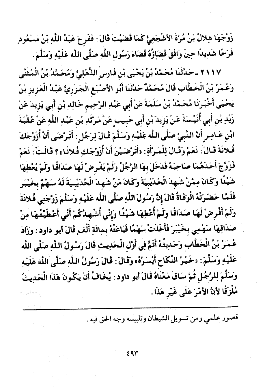 2117 - حَدَّثَنَا مُحَمَّدُ بْنُ يَحْيَى بْنِ فَارِسٍ الذُّهْلِيُّ، وَمُحَمَّدُ بْنُ الْمُثَنَّى، وَعُمَرُ بْنُ الْخَطَّابِ، قَالَ مُحَمَّدٌ: حَدَّثَنَا أَبُو الْأَصْبَغِ الْجَزَرِيُّ عَبْدُ الْعَزِيزِ بْنُ يَحْيَى، أَخْبَرَنَا مُحَمَّدُ بْنُ سَلَمَةَ، عَنْ أَبِي عَبْدِ الرَّحِيمِ خَالِدِ بْنِ أَبِي يَزِيدَ، عَنْ زَيْدِ بْنِ أَبِي أُنَيْسَةَ، عَنْ يَزِيدَ بْنِ أَبِي حَبِيبٍ، عَنْ مَرْثَدِ بْنِ عَبْدِ اللَّهِ، عَنْ عُقْبَةَ بْنِ عَامِرٍ، أَنَّ النَّبِيَّ صَلَّى اللهُ عَلَيْهِ وَسَلَّمَ قَالَ لِرَجُلٍ: «أَتَرْضَى أَنْ أُزَوِّجَكَ فُلَانَةَ؟ »، قَالَ: نَعَمْ، وَقَالَ لِلْمَرْأَةِ: «أَتَرْضَيْنَ أَنْ أُزَوِّجَكِ فُلَانًا؟ »، قَالَتْ: نَعَمْ، فَزَوَّجَ أَحَدَهُمَا صَاحِبَهُ فَدَخَلَ بِهَا الرَّجُلُ وَلَمْ يَفْرِضْ لَهَا صَدَاقًا، وَلَمْ يُعْطِهَا شَيْئًا وَكَانَ مِمَّنْ شَهِدَ الْحُدَيْبِيَةَ وَكَانَ مَنْ شَهِدَ الْحُدَيْبِيَةَ لَهُ سَهْمٌ بِخَيْبَرَ فَلَمَّا حَضَرَتْهُ الْوَفَاةُ قَالَ: إِنَّ رَسُولَ اللَّهِ صَلَّى اللهُ عَلَيْهِ وَسَلَّمَ زَوَّجَنِي فُلَانَةَ، وَلَمْ أَفْرِضْ لَهَا صَدَاقًا، وَلَمْ أُعْطِهَا شَيْئًا، وَإِنِّي أُشْهِدُكُمْ أَنِّي أَعْطَيْتُهَا مِنْ صَدَاقِهَا سَهْمِي بِخَيْبَرَ، فَأَخَذَتْ سَهْمًا فَبَاعَتْهُ بِمِائَةِ أَلْفٍ. قَالَ أَبُو دَاوُدَ: وَزَادَ عُمَرُ بْنُ الْخَطَّابِ، وَحَدِيثُهُ أَتَمُّ فِي أَوَّلِ الْحَدِيثِ قَالَ رَسُولُ اللَّهِ صَلَّى اللهُ عَلَيْهِ وَسَلَّمَ: «خَيْرُ النِّكَاحِ أَيْسَرُهُ»، وَقَالَ: قَالَ رَسُولُ اللَّهِ صَلَّى اللهُ عَلَيْهِ وَسَلَّمَ لِلرَّجُلِ ثُمَّ سَاقَ مَعْنَاهُ. قَالَ أَبُو دَاوُدَ: يُخَافُ أَنْ يَكُونَ هَذَا الْحَدِيثُ مُلْزَقًا لِأَنَّ الْأَمْرَ عَلَى غَيْرِ هَذَا.