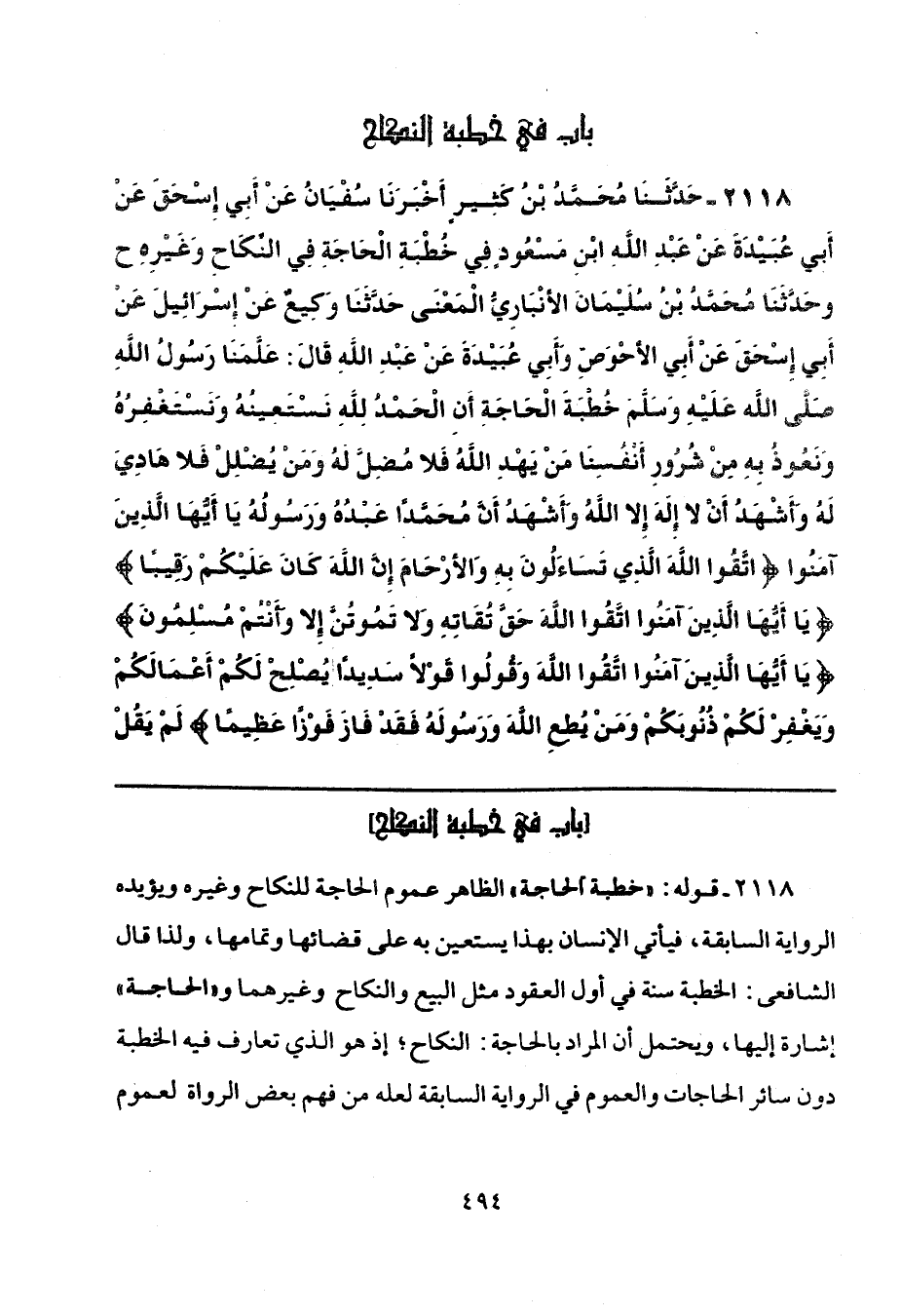 2118 - حَدَّثَنَا مُحَمَّدُ بْنُ كَثِيرٍ، أَخْبَرَنَا سُفْيَانُ، عَنْ أَبِي إِسْحَاقَ، عَنْ أَبِي عُبَيْدَةَ، عَنْ عَبْدِ اللَّهِ بْنِ مَسْعُودٍ، فِي خُطْبَةِ الْحَاجَةِ فِي النِّكَاحِ وَغَيْرِهِ، ح، وحَدَّثَنَا مُحَمَّدُ بْنُ سُلَيْمَانَ الْأَنْبَارِيُّ، الْمَعْنَى، حَدَّثَنَا وَكِيعٌ، عَنْ إِسْرَائِيلَ، عَنْ أَبِي إِسْحَاقَ، عَنْ أَبِي الْأَحْوَصِ، وَأَبِي عُبَيْدَةَ، عَنْ عَبْدِ اللَّهِ، قَالَ: عَلَّمَنَا رَسُولُ اللَّهِ صَلَّى اللهُ عَلَيْهِ وَسَلَّمَ خُطْبَةَ الْحَاجَةِ أَنِ الْحَمْدُ لِلَّهِ نَسْتَعِينُهُ وَنَسْتَغْفِرُهُ وَنَعُوذُ بِهِ مِنْ شُرُورِ أَنْفُسِنَا، مَنْ يَهْدِ اللَّهُ فَلَا مُضِلَّ لَهُ، وَمَنْ يُضْلِلْ فَلَا هَادِيَ لَهُ، وَأَشْهَدُ أَنْ لَا إِلَهَ إِلَّا اللَّهُ، وَأَشْهَدُ أَنَّ مُحَمَّدًا عَبْدُهُ وَرَسُولُهُ، يَا أَيُّهَا الَّذِينَ آمَنُوا {اتَّقُوا اللَّهَ الَّذِي تَسَاءَلُونَ بِهِ وَالْأَرْحَامَ إِنَّ اللَّهَ كَانَ عَلَيْكُمْ رَقِيبًا} [النساء: 1] {يَا أَيُّهَا الَّذِينَ آمَنُوا اتَّقُوا اللَّهَ حَقَّ تُقَاتِهِ وَلَا تَمُوتُنَّ إِلَّا وَأَنْتُمْ مُسْلِمُونَ} [آل عمران: 102] {يَا أَيُّهَا الَّذِينَ آمَنُوا اتَّقُوا اللَّهَ وَقُولُوا قَوْلًا سَدِيدًا يُصْلِحْ لَكُمْ أَعْمَالَكُمْ وَيَغْفِرْ لَكُمْ ذُنُوبَكُمْ وَمَنْ يُطِعِ اللَّهَ وَرَسُولَهُ فَقَدْ فَازَ فَوْزًا عَظِيمًا} [الأحزاب: 71]، لَمْ يَقُلْ