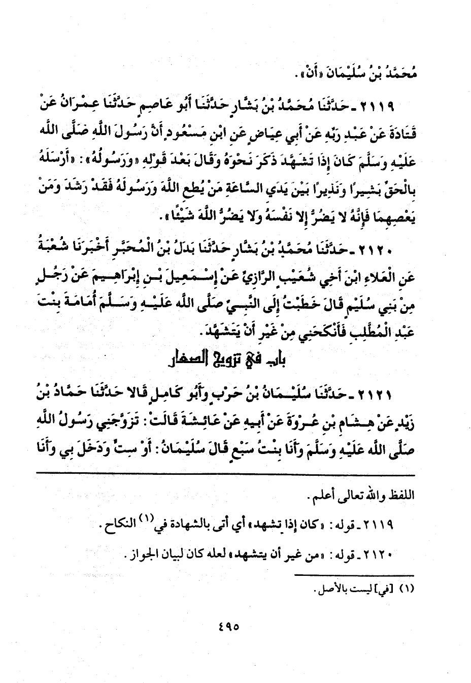 2120 - حَدَّثَنَا مُحَمَّدُ بْنُ بَشَّارٍ، حَدَّثَنَا بَدَلُ بْنُ الْمُحَبَّرِ، أَخْبَرَنَا شُعْبَةُ، عَنِ الْعَلَاءِ ابْنَ أَخِي شُعَيْبٍ الرَّازِيِّ، عَنْ إِسْمَاعِيلَ بْنِ إِبْرَاهِيمَ، عَنْ رَجُلٍ، مِنْ بَنِي سُلَيْمٍ، قَالَ: «خَطَبْتُ إِلَى النَّبِيِّ صَلَّى اللهُ عَلَيْهِ وَسَلَّمَ أُمَامَةَ بِنْتَ عَبْدِ الْمُطَّلِبِ فَأَنْكَحَنِي مِنْ غَيْرِ أَنْ يَتَشَهَّدَ».