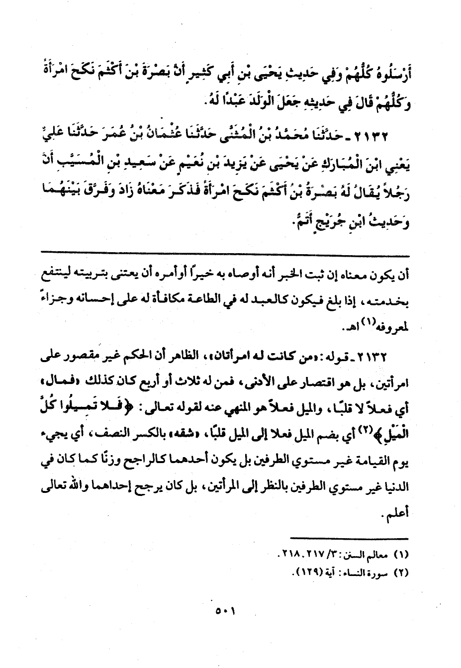 2132 - قوله: "من كانت له امرأتان"، الظاهر أن الحكم غير مقصور على امرأتين، بل هو اقتصار على الأدنى, فمن له ثلاث أو أربع كان كذلك "فمال" أي فعلًا لا قلبًا, والميل فعلًا هو المنهي عنه لقوله تعالى: {فَلَا تَمِيلُوا كُلَّ الْمَيلِ} (¬2) أي بضم الميل فعلا إلى الميل قلبًا, "شقه" بالكسر النصف, أي يجيء يوم القيامة غير مستوي الطرفين بل يكون أحدهما كالراجح وزنًا كما كان في الدنيا غير مستوي الطرفين بالنظر إلى المرأتين، بل كان يرجح إحداهما والله تعالى أعلم.