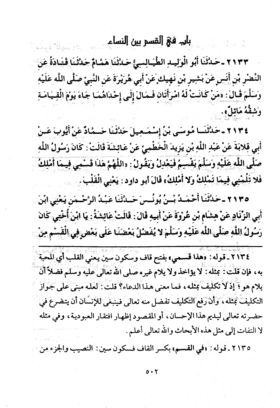 2135 - حَدَّثَنَا أَحْمَدُ بْنُ يُونُسَ، حَدَّثَنَا عَبْدُ الرَّحْمَنِ يَعْنِي ابْنَ أَبِي الزِّنَادِ عَنْ هِشَامِ بْنِ عُرْوَةَ، عَنْ أَبِيهِ، قَالَ: قَالَتْ عَائِشَةُ: «يَا ابْنَ أُخْتِي كَانَ رَسُولُ اللَّهِ صَلَّى اللهُ عَلَيْهِ وَسَلَّمَ لَا يُفَضِّلُ بَعْضَنَا عَلَى بَعْضٍ فِي الْقَسْمِ، مِنْ
