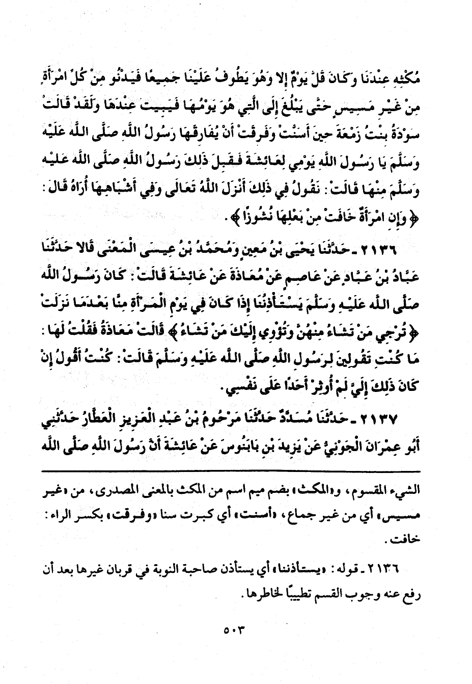 2136 - حَدَّثَنَا يَحْيَى بْنُ مَعِينٍ، وَمُحَمَّدُ بْنُ عِيسَى الْمَعْنَى، قَالَا: حَدَّثَنَا عَبَّادُ بْنُ عَبَّادٍ، عَنْ عَاصِمٍ، عَنْ مُعَاذَةَ، عَنْ عَائِشَةَ، قَالَتْ: " كَانَ رَسُولُ اللَّهِ صَلَّى اللهُ عَلَيْهِ وَسَلَّمَ يَسْتَأْذِنُنَا إِذَا كَانَ فِي يَوْمِ الْمَرْأَةِ مِنَّا بَعْدَمَا نَزَلَتْ {تُرْجِي مَنْ تَشَاءُ مِنْهُنَّ وَتُؤْوِي إِلَيْكَ مَنْ تَشَاءُ} [الأحزاب: 51] قَالَتْ مَعَاذَةُ: فَقُلْتُ لَهَا: «مَا كُنْتِ تَقُولِينَ لِرَسُولِ اللَّهِ صَلَّى اللهُ عَلَيْهِ وَسَلَّمَ؟ » قَالَتْ: كُنْتُ أَقُولُ إِنْ كَانَ ذَلِكَ إِلَيَّ لَمْ أُوثِرْ أَحَدًا عَلَى نَفْسِي.