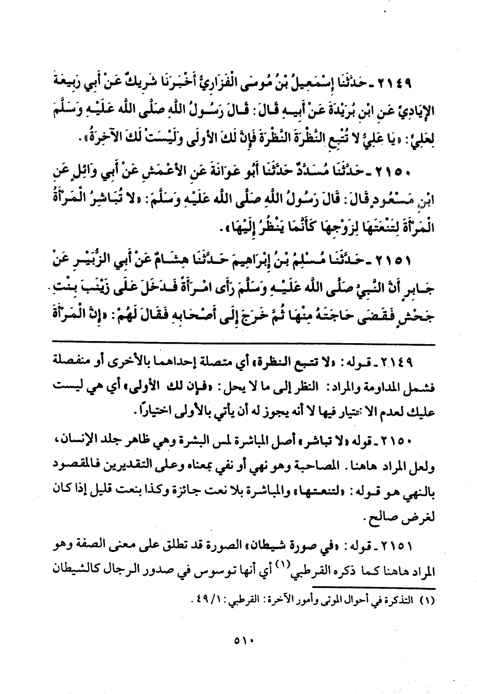 2149 - قوله: "لا تتبع النظرة" أي متصلة إحداهما بالأخرى أو منفصلة فشمل المداومة والمراد: النظر أبي ما لا يحل: "فإن لك الأولى" أي هي ليست عليك لعدم الاختيار فيها لا أنه يجوز له أن يأتي بالأولى اختيارًا.