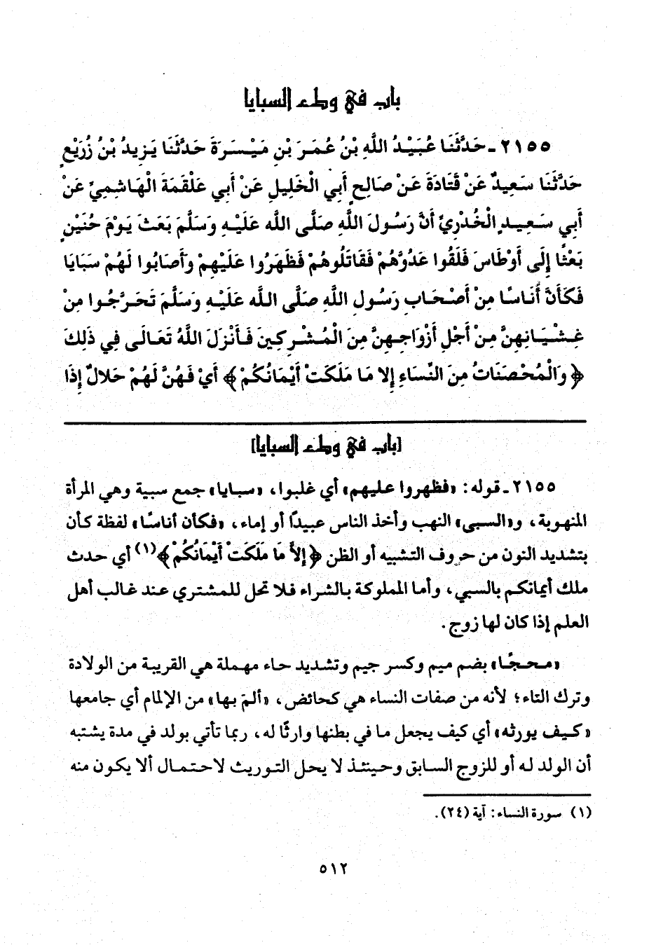 2155 - قوله: "فظهروا عليهم" أي غلبوا، "سبايا" جمع سبية وهي المرأة المنهوبة، و"السبى" النهب وأخذ الناس عبيدًا أو إماء, "فكان أناسًا" لفظة كأن بتشديد النون من حروف التشبيه أو الظن {إلا مَا مَلَكَتْ أَيمَانُكُمْ} (¬1) أي حدث ملك أيمانكم بالسبي, وأما المملوكة بالشراء فلا تحل للمشتري عند غالب أهل العلم إذا كان لها زوج.