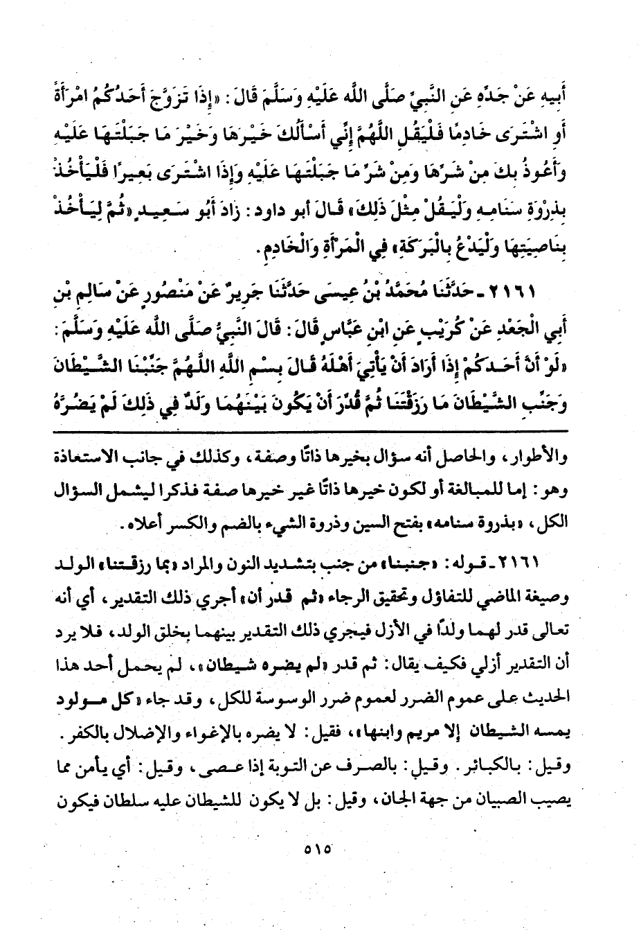 2161 - قوله: "جنبنا" من جنب بتشديد النون والمراد "بما رزقتنا" الولد وصيغة الماضي للتفاؤل وتحقيق الرجاء "ثم قدر أن" أجري ذلك التقدير، أي أنه تعالى قدر لهما ولدًا في الأزل فيجري ذلك التقدير بينهما بخلق الولد، فلا يرد أن التقدير أزلي فكيف يقال: ثم قدر "لم يضره شيطان"، لم يحمل أحد هذا الحديث على عموم الضرر لعموم ضرر الوسوسة للكل، وقد جاء "كل مولود يمسه الشيطان إلا مريم وابنها"، فقيل: لا يضره بالإغواء والإضلال بالكفر. وقيل: بالكبائر. وقيل: بالصرف عن التوبة إذا عصى، وقيل: أي يأمن مما يصيب الصبيان من جهة الجان, وقيل: بل لا يكون للشيطان عليه سلطان فيكون