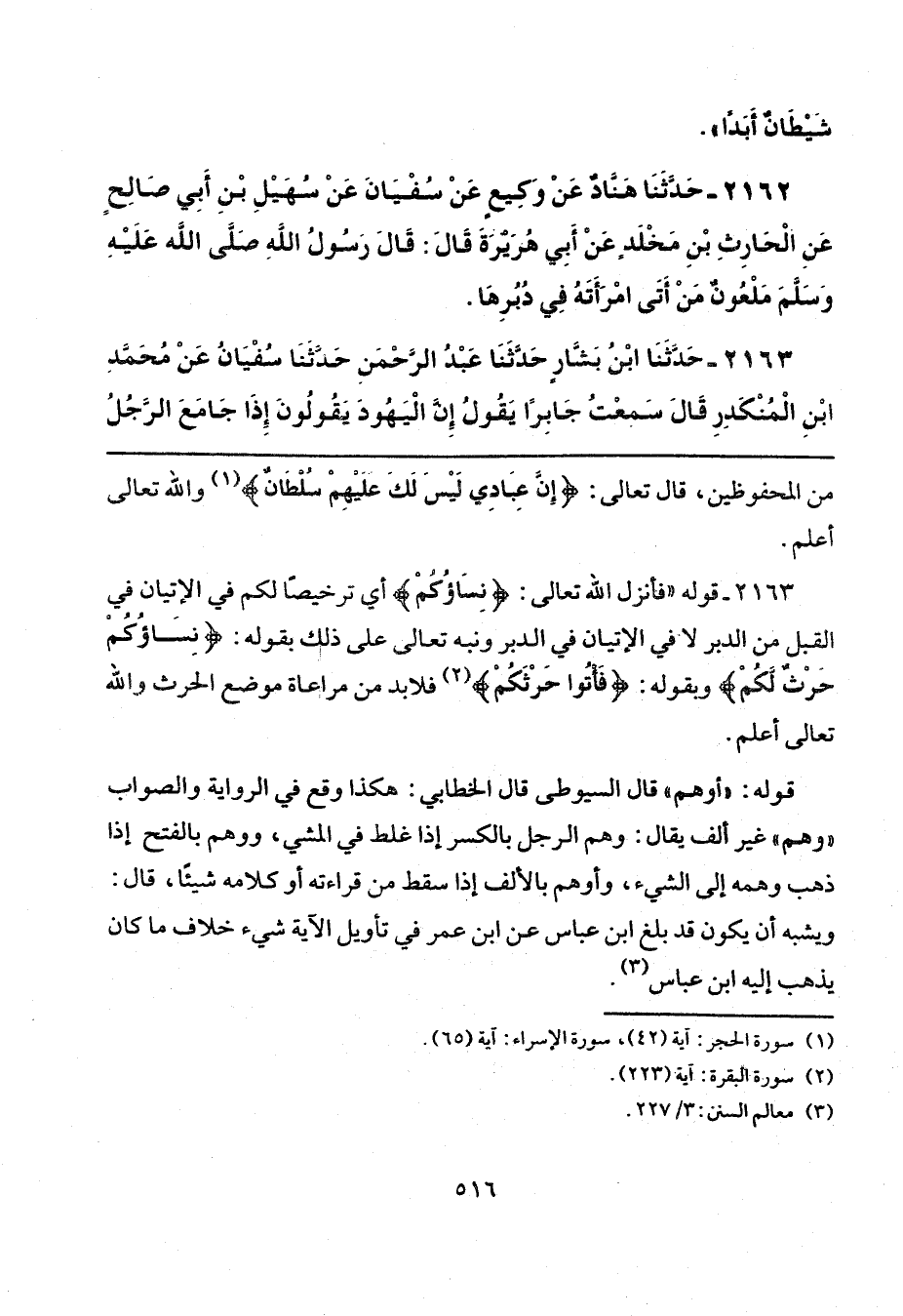 2163 - قوله "فأنزل الله تعالى: {نِسَاؤُكُمْ} أي ترخيصًا لكم في الإتيان في القبل من الدبر لا في الإتيان في الدبر ونبه تعالى على ذلك بقوله: {نِسَاؤُكُمْ حَرْثٌ لَكُمْ} وبقوله: {فَأْتُوا حَرْثَكُمْ} (¬2) فلا بد من مراعاة موضع الحرث والله تعالى أعلم.
