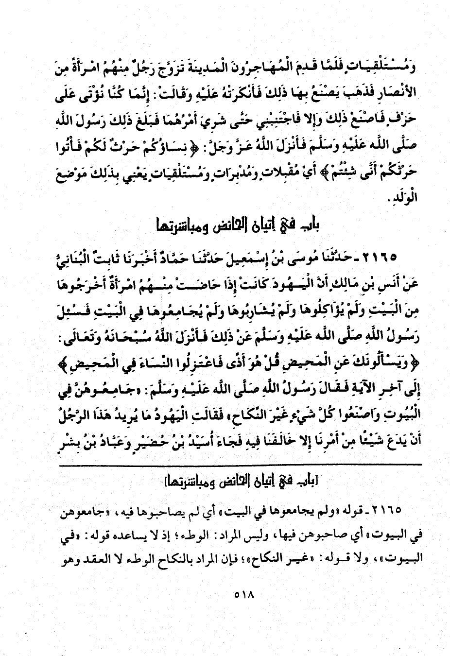 2165 - حَدَّثَنَا مُوسَى بْنُ إِسْمَاعِيلَ، حَدَّثَنَا حَمَّادٌ، أَخْبَرَنَا ثَابِتٌ الْبُنَانِيُّ، عَنْ أَنَسِ بْنِ مَالِكٍ، أَنَّ الْيَهُودَ كَانَتْ إِذَا حَاضَتْ مِنْهُمُ امْرَأَةٌ أَخْرَجُوهَا مِنَ الْبَيْتِ، وَلَمْ يُؤَاكِلُوهَا وَلَمْ يُشَارِبُوهَا، وَلَمْ يُجَامِعُوهَا فِي الْبَيْتِ فَسُئِلَ رَسُولُ اللَّهِ صَلَّى اللهُ عَلَيْهِ وَسَلَّمَ عَنْ ذَلِكَ، فَأَنْزَلَ اللَّهُ سُبْحَانَهُ وَتَعَالَى {وَيَسْأَلُونَكَ عَنِ المَحِيضِ، قُلْ: هُوَ أَذًى فَاعْتَزِلُوا النِّسَاءَ فِي الْمَحِيضِ} [البقرة: 222] إِلَى آخِرِ الْآيَةِ، فَقَالَ رَسُولُ اللَّهِ صَلَّى اللهُ عَلَيْهِ وَسَلَّمَ: «جَامِعُوهُنَّ فِي الْبُيُوتِ، وَاصْنَعُوا كُلَّ شَيْءٍ غَيْرَ النِّكَاحِ» فَقَالَتِ الْيَهُودُ: مَا يُرِيدُ هَذَا الرَّجُلُ أَنْ يَدَعَ شَيْئًا مِنْ أَمْرِنَا إِلَّا خَالَفَنَا فِيهِ، فَجَاءَ أُسَيْدُ بْنُ حُضَيْرٍ، وَعَبَّادُ بْنُ بِشْرٍ