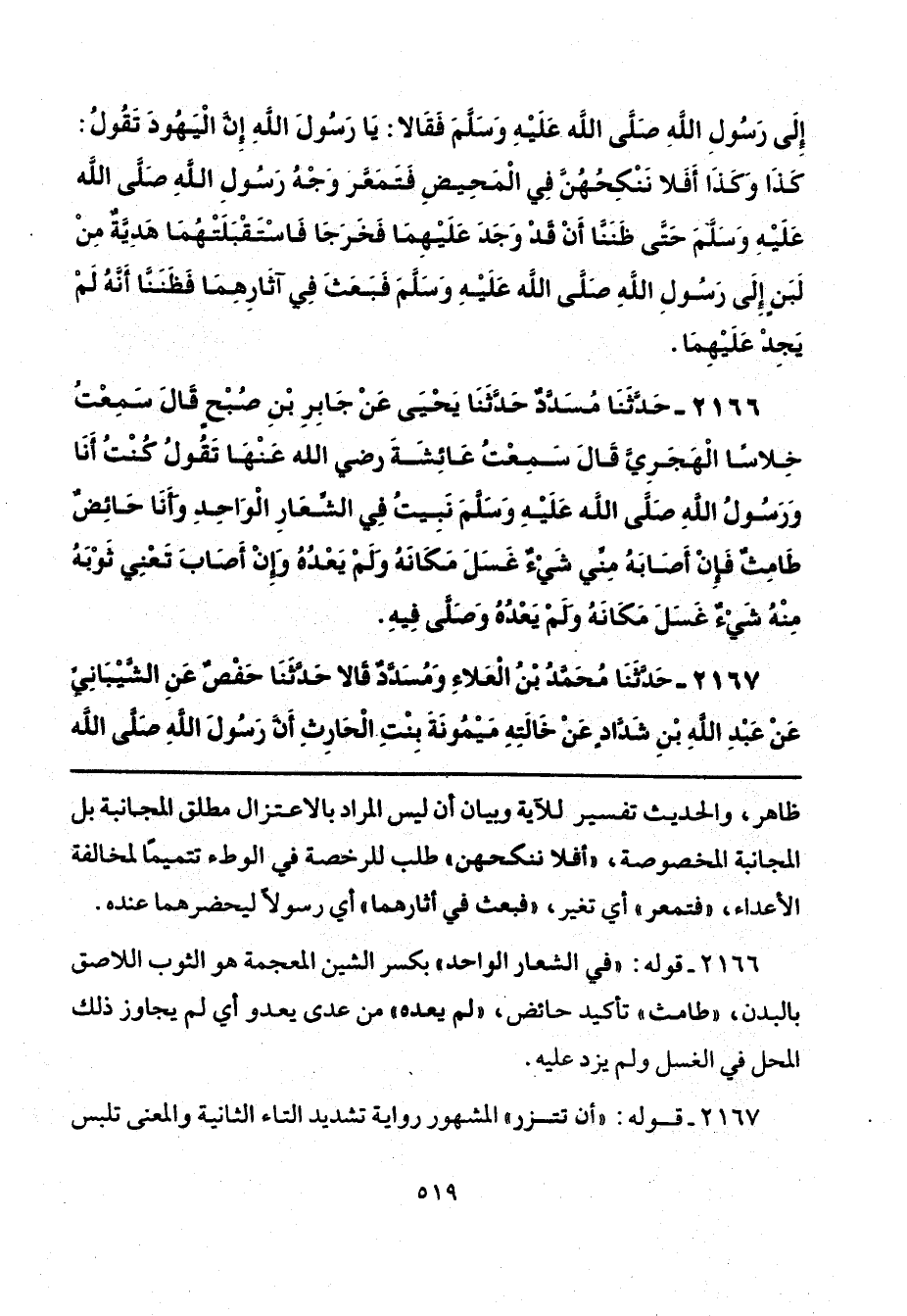2166 - قوله: "في الشعار الواحد" بكسر الشين المعجمة هو الثوب اللاصق بالبدن، "طامث" تأكيد حائض، "لم يعده" من عدى يعدو أي لم يجاوز ذلك المحل في الغسل ولم يزد عليه.