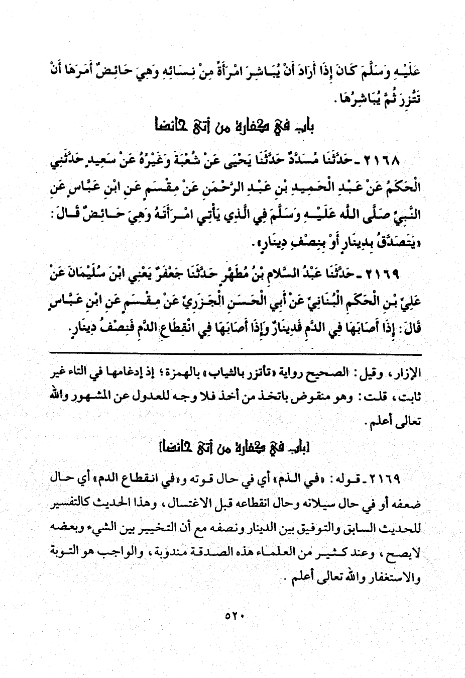 2169 - قوله: "في الذم" أي في حال قوته و"في انقطاع الدم" أي حال ضعفه أو في حال سيلانه وحال انقطاعه قبل الاغتسال، وهذا الحديث كالتفسير للحديث السابق والتوفيق بين الدينار ونصفه مع أن التخيير بين الشيء وبعضه لا يصح، وعند كثير من العلماء هذه الصدقة مندوبة، والواجب هو التوبة والاستغفار والله تعالى أعلم.