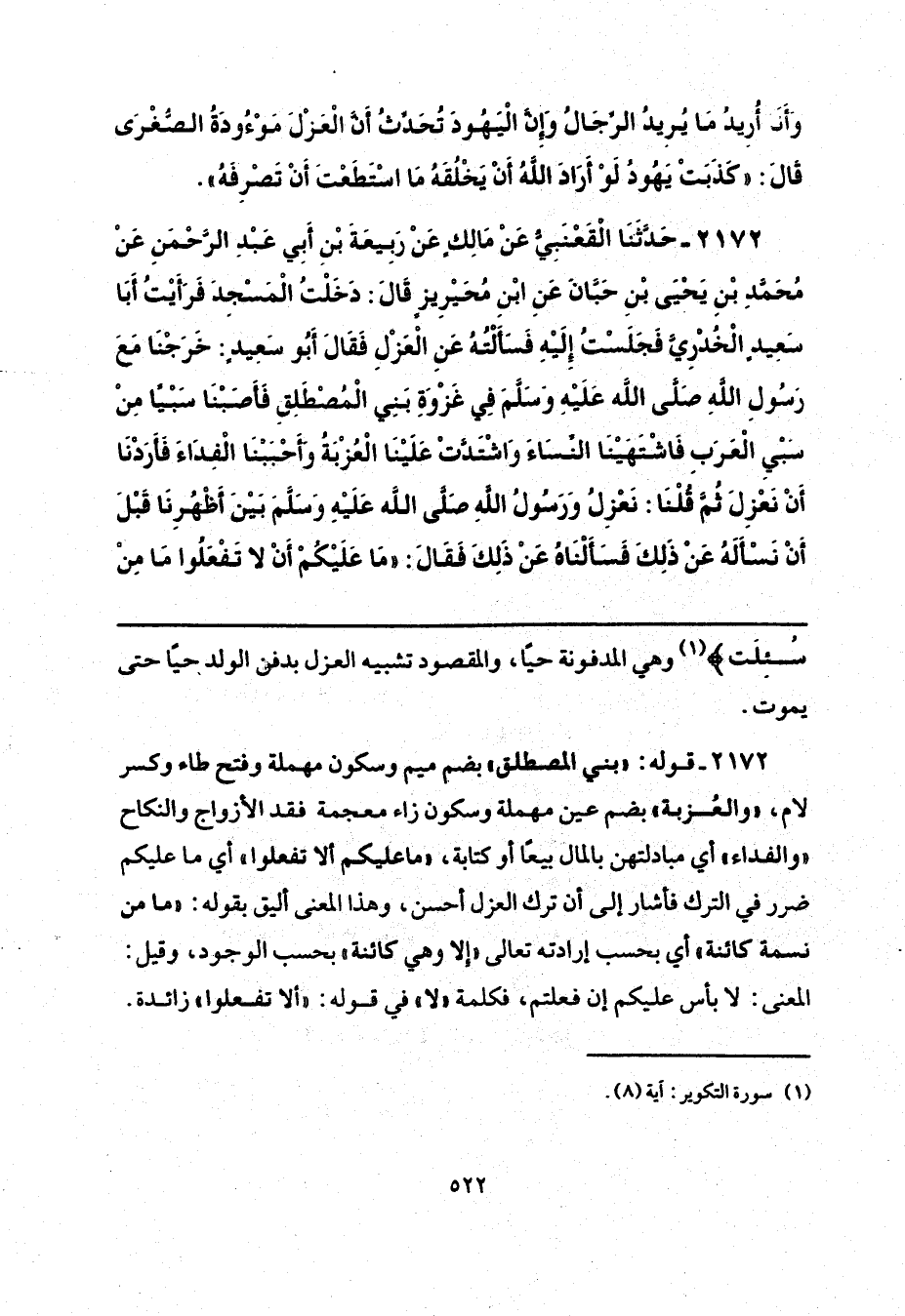 2172 - قوله: "بني المصطلق" بضم ميم وسكون مهملة وفتح طاء وكسر لام، "والعُزبة" بضم عين مهملة وسكون زاء معجمة فقد الأزواج والنكاح "والفداء" أي مبادلتهن بالمال بيعًا أو كتابة، "ما عليكم ألا تفعلوا" أي ما عليكم ضرر في الترك فأشار إلى أن ترك العزل أحسن، وهذا المعنى أليق بقوله: "ما من نسمة كائنة" أي بحسب إرادته تعالى "إلا وهي كائنة" بحسب الوجود، وقيل: المعنى: لا بأس عليكم إن فعلتم، فكلمة "لا" في قوله: "ألا تفعلوا" زائدة.