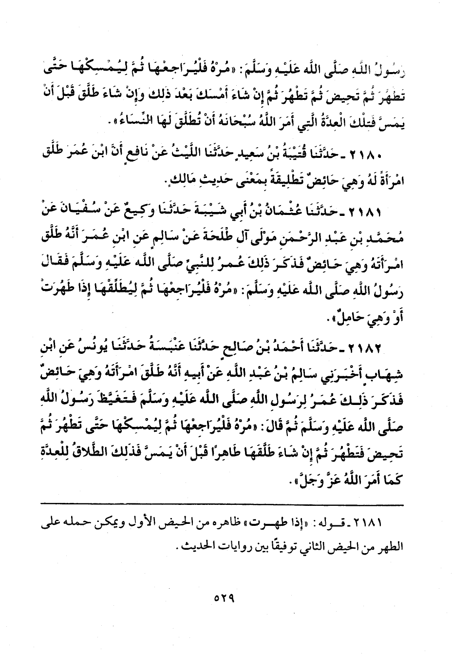 2181 - حَدَّثَنَا عُثْمَانُ بْنُ أَبِي شَيْبَةَ، حَدَّثَنَا وَكِيعٌ، عَنْ سُفْيَانَ، عَنْ مُحَمَّدِ بْنِ عَبْدِ الرَّحْمَنِ مَوْلَى آلِ طْلَحَةَ، عَنْ سَالِمٍ، عَنِ ابْنِ عُمَرَ، أَنَّهُ طَلَّقَ امْرَأَتَهُ، وَهِيَ حَائِضٌ، فَذَكَرَ ذَلِكَ عُمَرُ لِلنَّبِيِّ صَلَّى اللهُ عَلَيْهِ وَسَلَّمَ، فَقَالَ رَسُولُ اللَّهِ صَلَّى اللهُ عَلَيْهِ وَسَلَّمَ: «مُرْهُ فَلْيُرَاجِعْهَا، ثُمَّ لِيُطَلِّقْهَا إِذَا طَهُرَتْ، أَوْ وَهِيَ حَامِلٌ».