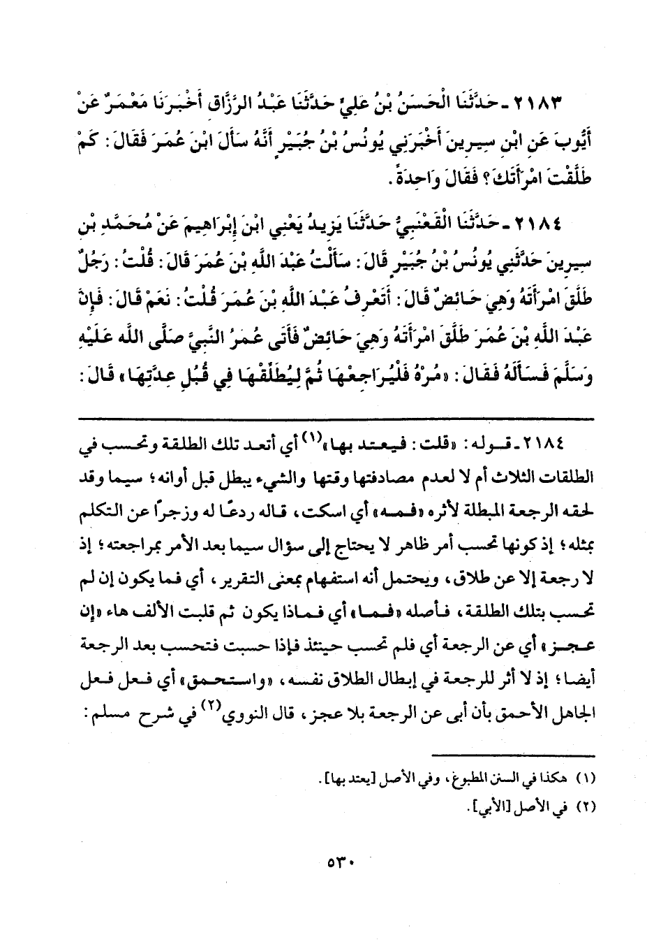 2184 - حَدَّثَنَا الْقَعْنَبِيُّ، حَدَّثَنَا يَزِيدُ يَعْنِي ابْنَ إِبْرَاهِيمَ، عَنْ مُحَمَّدِ بْنِ سِيرِينَ، حَدَّثَنِي يُونُسُ بْنُ جُبَيْرٍ قَالَ: سَأَلْتُ عَبْدَ اللَّهِ بْنَ عُمَرَ قَالَ: قُلْتُ: رَجُلٌ طَلَّقَ امْرَأَتَهُ، وَهِيَ حَائِضٌ، قَالَ: أَتَعْرِفُ عَبْدَ اللَّهِ بْنَ عُمَرَ، قُلْتُ: نَعَمْ، قَالَ: فَإِنَّ عَبْدَ اللَّهِ بْنَ عُمَرَ طَلَّقَ امْرَأَتَهُ، وَهِيَ حَائِضٌ، فَأَتَى عُمَرُ النَّبِيَّ صَلَّى اللهُ عَلَيْهِ وَسَلَّمَ فَسَأَلَهُ، فَقَالَ: «مُرْهُ فَلْيُرَاجِعْهَا، ثُمَّ لِيُطَلِّقْهَا فِي قُبُلِ عِدَّتِهَا»، قَالَ: