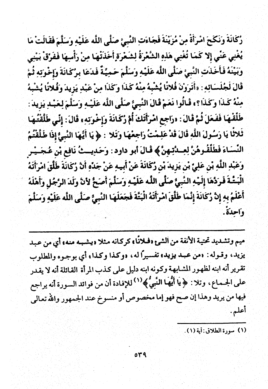 رُكَانَةَ، وَنَكَحَ امْرَأَةً مِنْ مُزَيْنَةَ، فَجَاءَتِ النَّبِيَّ صَلَّى اللهُ عَلَيْهِ وَسَلَّمَ، فَقَالَتْ: مَا يُغْنِي عَنِّي إِلَّا كَمَا تُغْنِي هَذِهِ الشَّعْرَةُ، لِشَعْرَةٍ أَخَذَتْهَا مِنْ رَأْسِهَا، فَفَرِّقْ بَيْنِي وَبَيْنَهُ، فَأَخَذَتِ النَّبِيَّ صَلَّى اللهُ عَلَيْهِ وَسَلَّمَ حَمِيَّةٌ، فَدَعَا بِرُكَانَةَ، وَإِخْوَتِهِ، ثُمَّ قَالَ لَجُلَسَائِهِ: «أَتَرَوْنَ فُلَانًا يُشْبِهُ مِنْهُ كَذَا وَكَذَا؟ ، مِنْ عَبْدِ يَزِيدَ، وَفُلَانًا يُشْبِهُ مِنْهُ كَذَا وَكَذَا؟ » قَالُوا: نَعَمْ، قَالَ النَّبِيُّ صَلَّى اللهُ عَلَيْهِ وَسَلَّمَ لِعَبْدِ يَزِيدَ: «طَلِّقْهَا» فَفَعَلَ، ثُمَّ قَالَ: «رَاجِعِ امْرَأَتَكَ أُمَّ رُكَانَةَ وَإِخْوَتِهِ؟ » قَالَ: إِنِّي طَلَّقْتُهَا ثَلَاثًا يَا رَسُولَ اللَّهِ، قَالَ: «قَدْ عَلِمْتُ رَاجِعْهَا» وَتَلَا: {يَا أَيُّهَا النَّبِيُّ إِذَا طَلَّقْتُمُ النِّسَاءَ فَطَلِّقُوهُنَّ لِعِدَّتِهِنَّ} [الطلاق: 1]، قَالَ أَبُو دَاوُدَ: وَحَدِيثُ نَافِعِ بْنِ عُجَيْرٍ، وَعَبْدِ اللَّهِ بْنِ عَلِيِّ بْنِ يَزِيدَ بْنِ رُكَانَةَ، عَنْ أَبِيهِ، عَنْ جَدِّهِ، أَنَّ رُكَانَةَ، طَلَّقَ امْرَأَتَهُ الْبَتَّةَ، فَرَدَّهَا إِلَيْهِ النَّبِيُّ صَلَّى اللهُ عَلَيْهِ وَسَلَّمَ «أَصَحُّ، لِأَنَّ وَلَدَ الرَّجُلِ، وَأَهْلَهُ أَعْلَمُ بِهِ، إِنَّ رُكَانَةَ إِنَّمَا طَلَّقَ امْرَأَتَهُ الْبَتَّةَ، فَجَعَلَهَا النَّبِيُّ صَلَّى اللهُ عَلَيْهِ وَسَلَّمَ وَاحِدَةً».