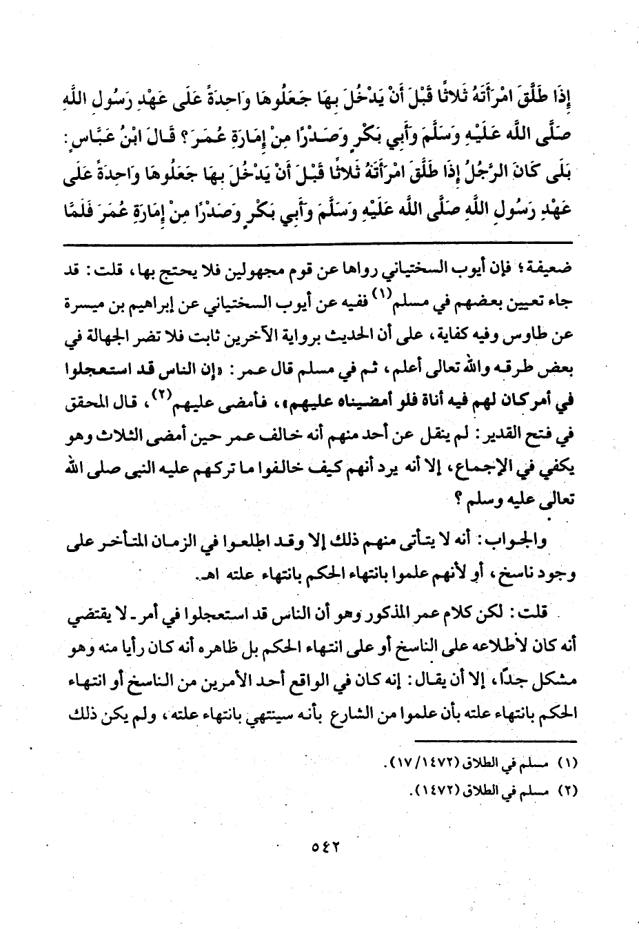 ضعيفة؛ فإن أيوب السختياني رواها عن قوم مجهولين فلا يحتج بها، قلت: قد جاء تعيين بعضهم في مسلم (¬1) ففيه عن أيوب السختياني عن إبراهيم بن ميسرة عن طاوس وفيه كفاية، على أن الحديث برواية الآخرين ثابت فلا تضر الجهالة في بعض طرقه والله تعالى أعلم، ثم في مسلم قال عمر: "إن الناس قد استعجلوا في أمر كان لهم فيه أناة فلو أمضيناه عليهم"، فأمضى عليهم (¬2)، قال المحقق في فتح القدير: لم ينقل عن أحد منهم أنه خالف عمر حين أمضى الثلاث وهو يكفي في الإجماع، إلا أنه يرد أنهم كيف خالفوا ما تركهم عليه النبي صلى الله تعالى عليه وسلم؟