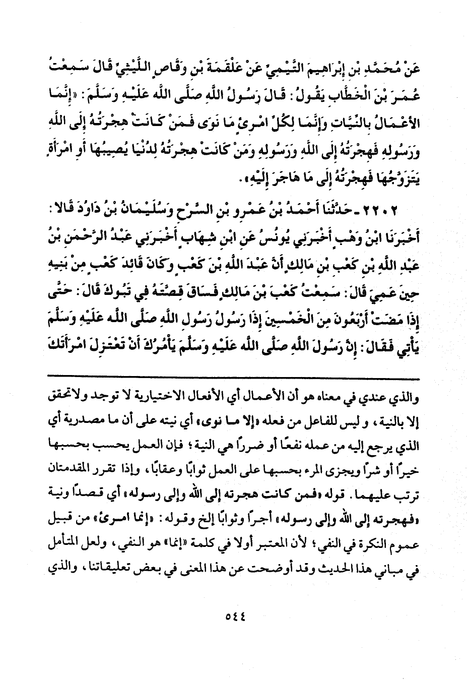 والذي عندي في معناه هو أن الأعمال أي الأفعال الاختيارية لا توجد ولا تحقق إلا بالنية، وليس للفاعل من فعله "إلا ما نوى" أي نيته على أن ما مصدرية أي الذي يرجع إليه من عمله نفعًا أو ضررًا هي النية؛ فإن العمل يحسب بحسبها خيرًا أو شرًّا ويجزى المرء بحسبها على العمل ثوابًا وعقابًا، وإذا تقرر المقدمتان ترتب عليهما. قولها "فمن كانت هجرته إلى الله وإلى رسوله" أي قصدًا ونية "فهجرته إلى الله وإلى رسوله" أجرًا وثوابًا إلخ وقوله: "إنما امرئ" من قبيل عموم النكرة في النفي؛ لأن المعتبر أولًا في كلمة "إنما" هو النفي، ولعل المتأمل في مباني هذا الحديث وقد أوضحت عن هذا المعنى في بعض تعليقاتنا، والذي