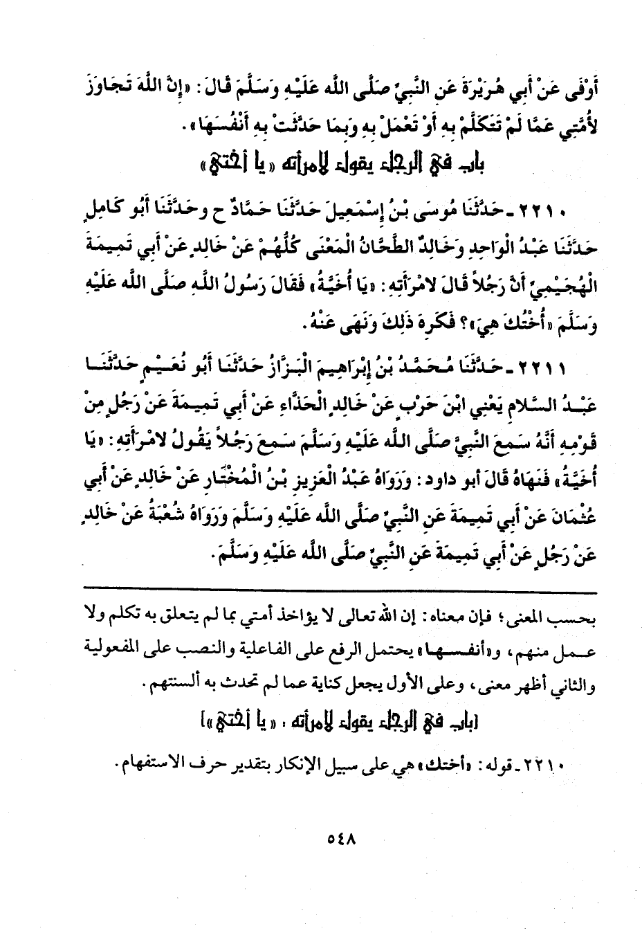 2210 - حَدَّثَنَا مُوسَى بْنُ إِسْمَاعِيلَ، حَدَّثَنَا حَمَّادٌ، ح وحَدَّثَنَا أَبُو كَامِلٍ، حَدَّثَنَا عَبْدُ الْوَاحِدِ، وَخَالِدٌ الطَّحَّانُ، الْمَعْنَى كُلُّهُمْ عَنْ خَالِدٍ، عَنْ أَبِي تَمِيمَةَ الْهُجَيْمِيِّ، أَنَّ رَجُلًا قَالَ لِامْرَأَتِهِ: يَا أُخَيَّةُ، فَقَالَ رَسُولُ اللَّهِ صَلَّى اللهُ عَلَيْهِ وَسَلَّمَ: «أُخْتُكَ هِيَ؟ »، فَكَرِهَ ذَلِكَ وَنَهَى عَنْهُ.