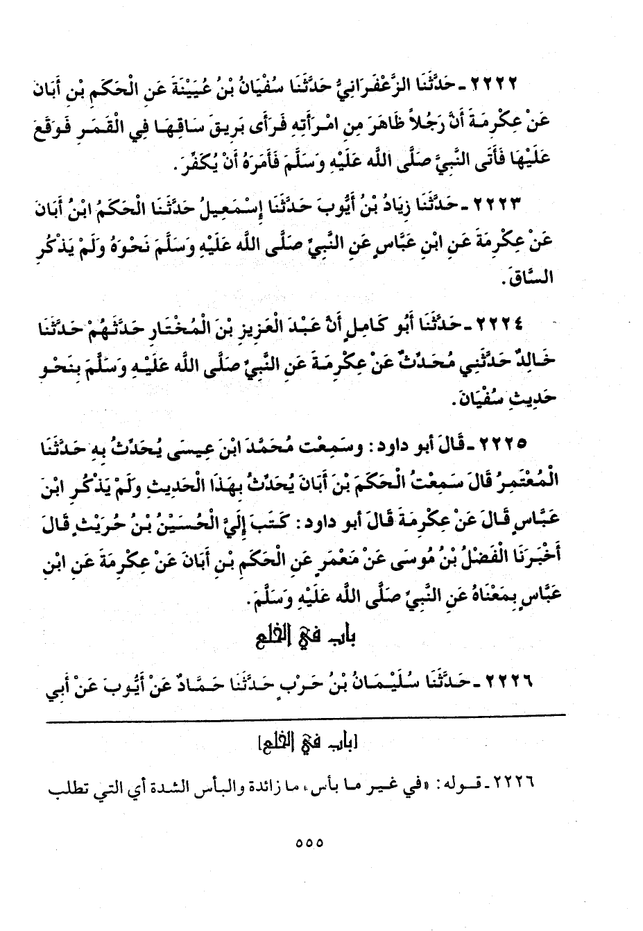 2225 - قَالَ أَبُو دَاوُدَ: وسَمِعْت مُحَمَّدَ بْنَ عِيسَى يُحَدِّثُ بِهِ، حَدَّثَنَا الْمُعْتَمِرُ قَالَ: سَمِعْتُ الْحَكَمَ بْنَ أَبَانَ يُحَدِّثُ بِهَذَا الْحَدِيثِ، وَلَمْ يَذْكُرْ ابْنَ عَبَّاسٍ قَالَ: عَنْ عِكْرِمَةَ، قَالَ أَبُو دَاوُدَ: كَتَبَ إِلَيَّ الْحُسَيْنُ بْنُ حُرَيْثٍ، قَالَ: أَخْبَرَنَا الْفَضْلُ بْنُ مُوسَى، عَنْ مَعْمَرٍ، عَنِ الْحَكَمِ بْنِ أَبَانَ، عَنْ عِكْرِمَةَ، عَنْ ابْنِ عَبَّاسٍ، بِمَعْنَاهُ عَنِ النَّبِيِّ صَلَّى اللهُ عَلَيْهِ وَسَلَّمَ.