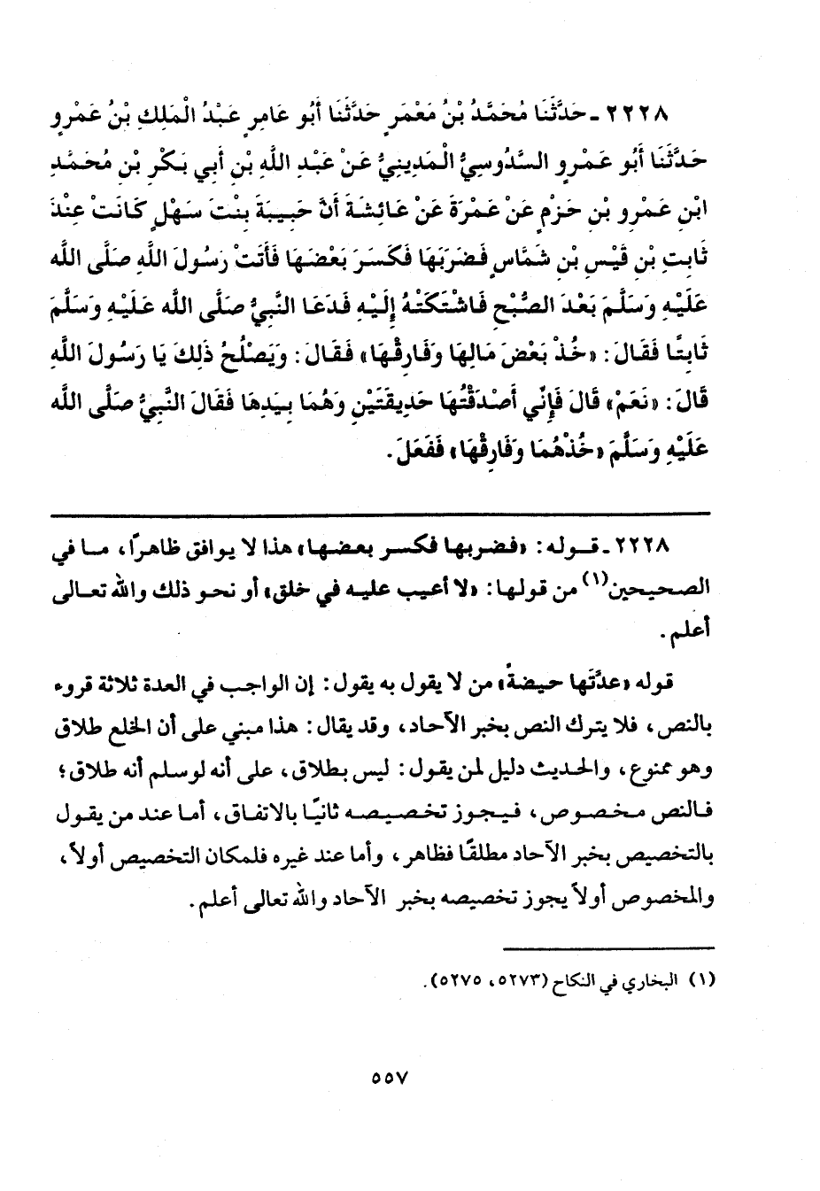 2228 - حَدَّثَنَا مُحَمَّدُ بْنُ مَعْمَرٍ، حَدَّثَنَا أَبُو عَامِرٍ عَبْدُ الْمَلِكِ بْنُ عَمْرٍو، حَدَّثَنَا أَبُو عَمْرٍو السَّدُوسِيُّ الْمَدِينِيُّ، عَنْ عَبْدِ اللَّهِ بْنِ أَبِي بَكْرِ بْنِ مُحَمَّدِ بْنِ عَمْرِو بْنِ حَزْمٍ، عَنْ عَمْرَةَ، عَنْ عَائِشَةَ، أَنَّ حَبِيبَةَ بِنْتَ سَهْلٍ، كَانَتْ عِنْدَ ثَابِتِ بْنِ قَيْسِ بْنِ شَمَّاسٍ فَضَرَبَهَا فَكَسَرَ بَعْضَهَا، فَأَتَتْ رَسُولَ اللَّهِ صَلَّى اللهُ عَلَيْهِ وَسَلَّمَ بَعْدَ الصُّبْحِ، فَاشْتَكَتْهُ إِلَيْهِ، فَدَعَا النَّبِيُّ صَلَّى اللهُ عَلَيْهِ وَسَلَّمَ ثَابِتًا، فَقَالَ: «خُذْ بَعْضَ مَالِهَا، وَفَارِقْهَا»، فَقَالَ: وَيَصْلُحُ ذَلِكَ يَا رَسُولَ اللَّهِ؟ ، قَالَ: «نَعَمْ»، قَالَ: فَإِنِّي أَصْدَقْتُهَا حَدِيقَتَيْنِ، وَهُمَا بِيَدِهَا، فَقَالَ النَّبِيُّ صَلَّى اللهُ عَلَيْهِ وَسَلَّمَ: «خُذْهُمَا وَفَارِقْهَا»، فَفَعَلَ.