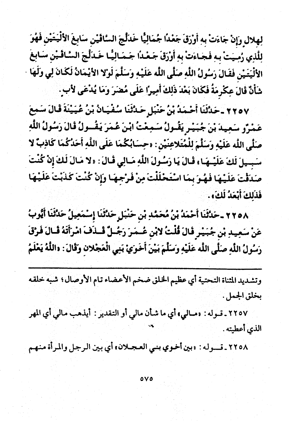 2258 - حَدَّثَنَا أَحْمَدُ بْنُ مُحَمَّدِ بْنِ حَنْبَلٍ، حَدَّثَنَا إِسْمَاعِيلُ، حَدَّثَنَا أَيُّوبُ، عَنْ سَعِيدِ بْنِ جُبَيْرٍ، قَالَ: قُلْتُ لِابْنِ عُمَرَ: رَجُلٌ قَذَفَ امْرَأَتَهُ، قَالَ: فَرَّقَ رَسُولُ اللَّهِ صَلَّى اللهُ عَلَيْهِ وَسَلَّمَ بَيْنَ أَخَوَيْ بَنِي الْعَجْلَانِ، وَقَالَ: «اللَّهُ يَعْلَمُ