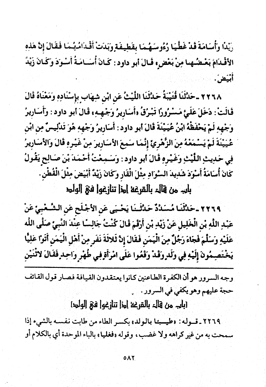 زَيْدًا، وَأُسَامَةَ قَدْ غَطَّيَا رُءُوسَهُمَا بِقَطِيفَةٍ، وَبَدَتْ أَقْدَامُهُمَا فَقَالَ: إِنَّ هَذِهِ الْأَقْدَامَ بَعْضُهَا مِنْ بَعْضٍ، قَالَ أَبُو دَاوُدَ: «كَانَ أُسَامَةُ أَسْوَدَ، وَكَانَ زَيْدٌ أَبْيَضَ».