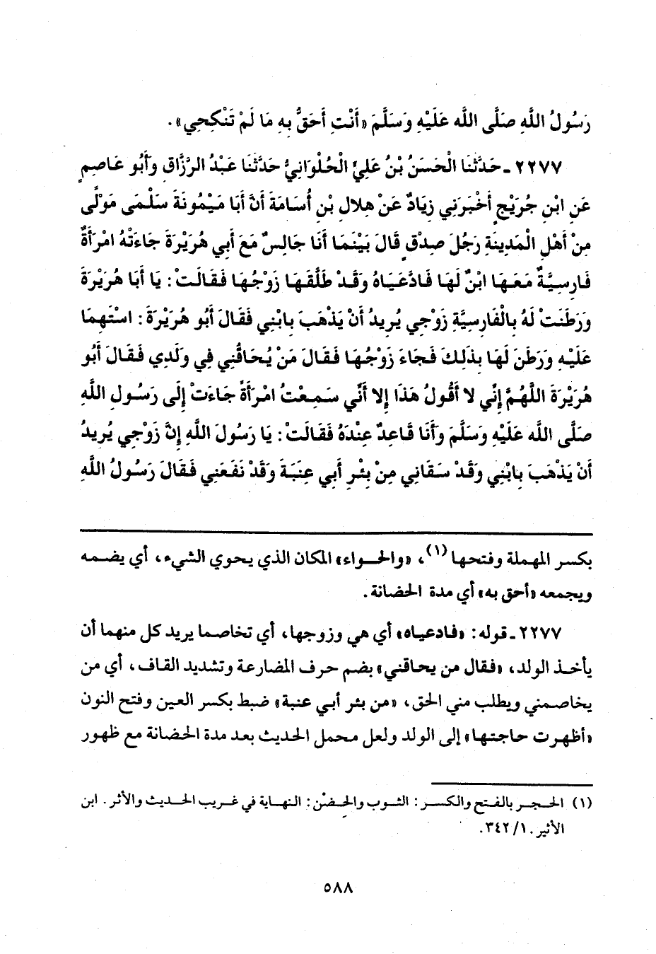 2277 - حَدَّثَنَا الْحَسَنُ بْنُ عَلِيٍّ الْحُلْوَانِيُّ، حَدَّثَنَا عَبْدُ الرَّزَّاقِ، وَأَبُوعَاصِمٍ، عَنِ ابْنِ جُرَيْجٍ، أَخْبَرَنِي زِيَادٌ، عَنْ هِلَالِ بْنِ أُسَامَةَ، أَنَّ أَبَا مَيْمُونَةَ سَلْمَى مَوْلًى مِنْ أَهْلِ الْمَدِينَةِ رَجُلَ صِدْقٍ، قَالَ: بَيْنَمَا أَنَا جَالِسٌ مَعَ أَبِي هُرَيْرَةَ، جَاءَتْهُ امْرَأَةٌ فَارِسِيَّةٌ مَعَهَا ابْنٌ لَهَا فَادَّعَيَاهُ، وَقَدْ طَلَّقَهَا زَوْجُهَا، فَقَالَتْ: يَا أَبَا هُرَيْرَةَ، وَرَطَنَتْ لَهُ بِالْفَارِسِيَّةِ، زَوْجِي يُرِيدُ أَنْ يَذْهَبَ بِابْنِي، فَقَالَ أَبُو هُرَيْرَةَ: اسْتَهِمَا عَلَيْهِ وَرَطَنَ لَهَا بِذَلِكَ، فَجَاءَ زَوْجُهَا، فَقَالَ: مَنْ يُحَاقُّنِي فِي وَلَدِي، فَقَالَ أَبُو هُرَيْرَةَ: اللَّهُمَّ إِنِّي لَا أَقُولُ هَذَا إِلَّا أَنِّي سَمِعْتُ امْرَأَةً جَاءَتْ إِلَى رَسُولِ اللَّهِ صَلَّى اللهُ عَلَيْهِ وَسَلَّمَ، وَأَنَا قَاعِدٌ عِنْدَهُ، فَقَالَتْ: يَا رَسُولَ اللَّهِ، إِنَّ زَوْجِي يُرِيدُ أَنْ يَذْهَبَ بِابْنِي، وَقَدْ سَقَانِي مِنْ بِئْرِ أَبِي عِنَبَةَ، وَقَدْ نَفَعَنِي، فَقَالَ رَسُولُ اللَّهِ