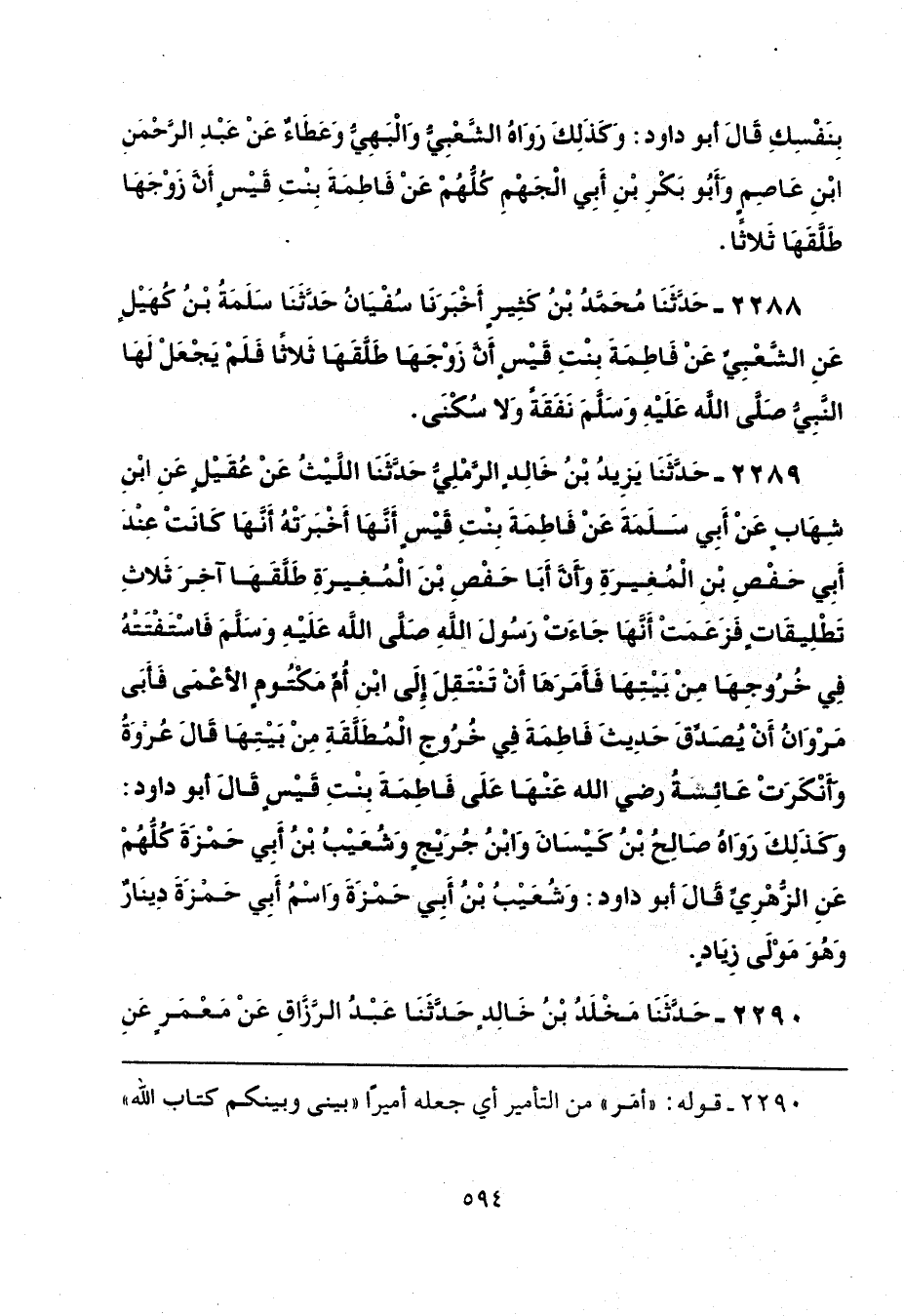 2289 - حَدَّثَنَا يَزِيدُ بْنُ خَالِدٍ الرَّمْلِيُّ، حَدَّثَنَا اللَّيْثُ، عَنْ عُقَيْلٍ، عَنِ ابْنِ شِهَابٍ، عَنْ أَبِي سَلَمَةَ، عَنْ فَاطِمَةَ بِنْتِ قَيْسٍ، أَنَّهَا أَخْبَرَتْهُ أَنَّهَا كَانَتْ عِنْدَ أَبِي حَفْصِ بْنِ الْمُغِيرَةِ، وَأَنَّ أَبَا حَفْصِ بْنَ الْمُغِيرَةِ طَلَّقَهَا آخِرَ ثَلَاثِ تَطْلِيقَاتٍ، فَزَعَمَتْ أَنَّهَا جَاءَتْ رَسُولَ اللَّهِ صَلَّى اللهُ عَلَيْهِ وَسَلَّمَ، فَاسْتَفْتَتْهُ فِي خُرُوجِهَا مِنْ بَيْتِهَا، فَأَمَرَهَا أَنْ تَنْتَقِلَ إِلَى ابْنِ أُمِّ مَكْتُومٍ الْأَعْمَى "، فَأَبَى مَرْوَانُ أَنْ يُصَدِّقَ حَدِيثَ فَاطِمَةَ فِي خُرُوجِ الْمُطَلَّقَةِ مِنْ بَيْتِهَا، قَالَ عُرْوَةُ: وَأَنْكَرَتْ عَائِشَةُ رَضِيَ اللَّهُ عَنْهَا عَلَى فَاطِمَةَ بِنْتِ قَيْسٍ، قَالَ أَبُو دَاوُدَ: وَكَذَلِكَ رَوَاهُ صَالِحُ بْنُ كَيْسَانَ، وَابْنُ جُرَيْجٍ، وَشُعَيْبُ بْنُ أَبِي حَمْزَةَ، كُلُّهُمْ عَنِ الزُّهْرِيِّ. قَالَ أَبُو دَاوُدَ: «وَشُعَيْبُ بْنُ أَبِي حَمْزَةَ، وَاسْمُ أَبِي حَمْزَةَ دِينَارٌ وَهُوَ مَوْلَى زِيَادٍ».