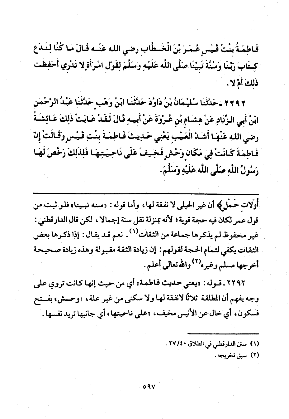 أُوْلاتِ حَمْلٍ} أن غير الحبلى لا نفقة لها، وأما قوله "سنة نبينا" فلو ثبت من قول عمر لكان فيه حجة قوية؛ لأنه بمنزلة نقل سنة إجمالا، لكن قال الدارقطني: غير محفوظ لم يذكرها جماعة من الثقات (¬1). نعم قد يقال: إذا ذكرها بعض الثقات يكفي لتمام الحجة لقولهم: إن زيادة الثقة مقبولة وهذه زيادة صحيحة أخرجها مسلم وغيره (¬2) والله تعالى أعلم.