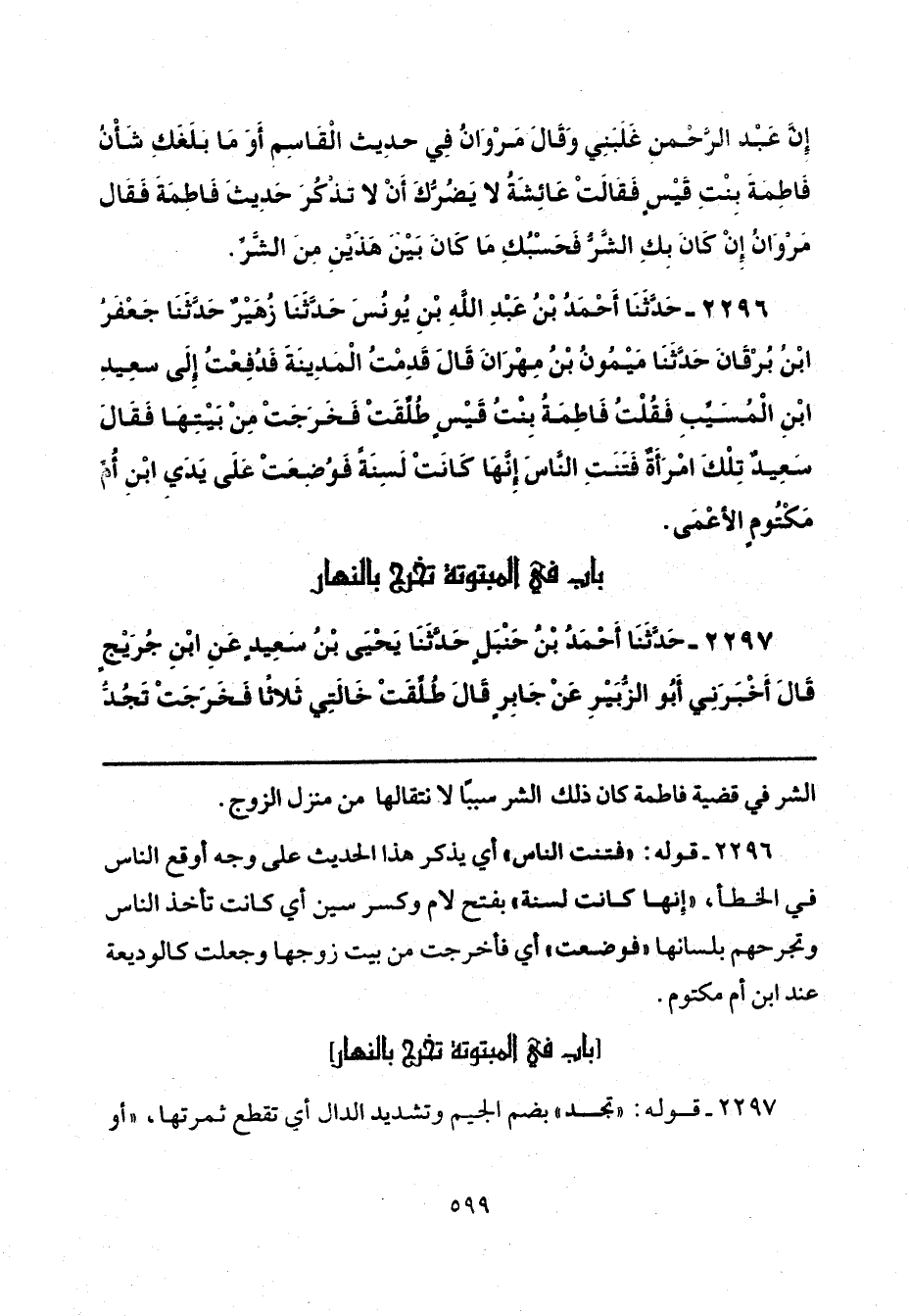 2296 - قوله: "فتنت الناس" أي يذكر هذا الحديث على وجه أوقع الناس في الخطأ، "إنها كانت لسنة" بفتح لام وكسر سين أي كانت تأخذ الناس وتجرحهم بلسانها "فوضعت" أي فأخرجت من بيت زوجها وجعلت كالوديعة عند ابن أم مكتوم.