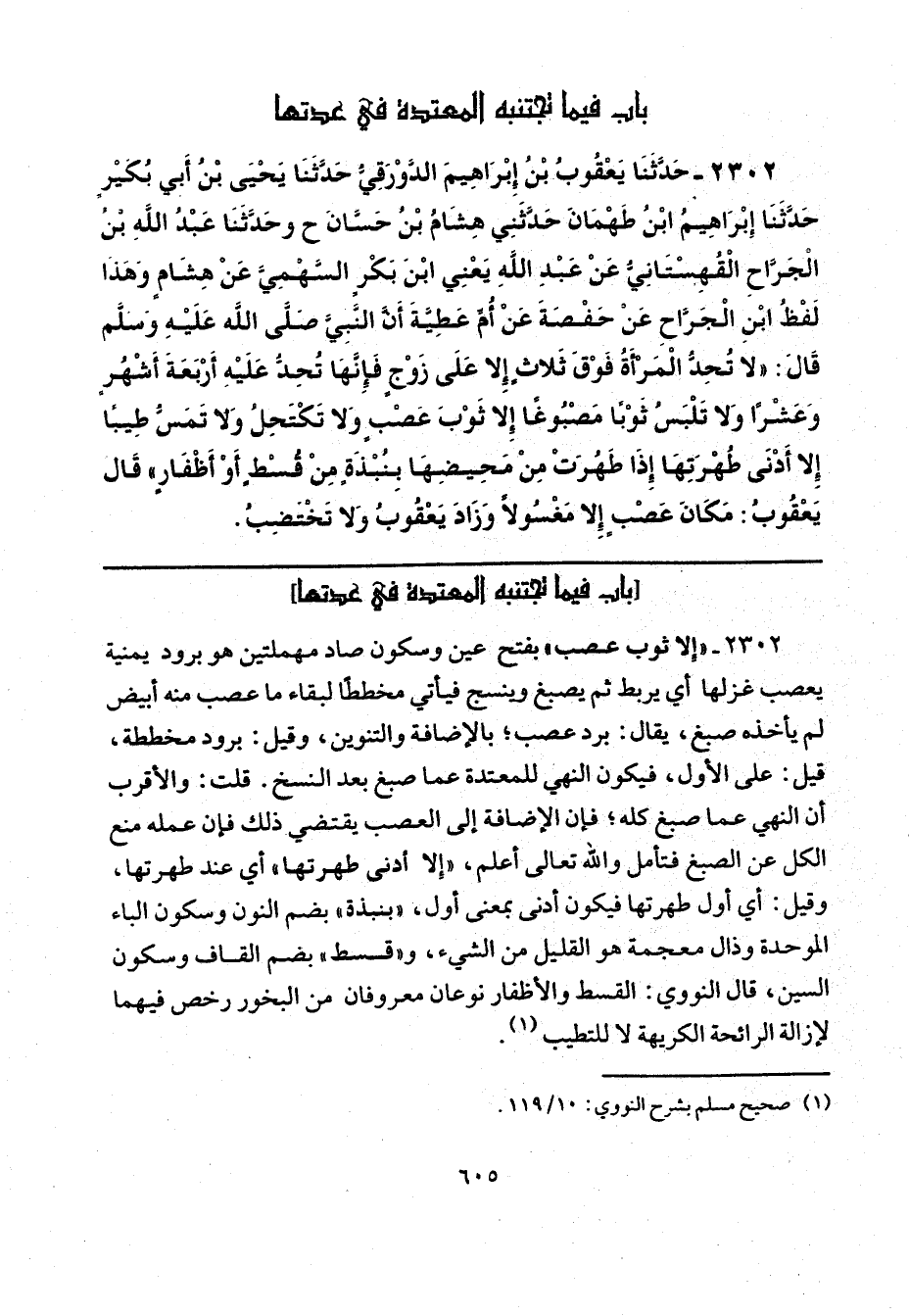 2302 - "إلا ثوب عصب" بفتح عين وسكون صاد مهملتين هو برود يمنية يعصب غزلها أي يربط ثم يصبغ وينسج فيأتي مخططًا لبقاء ما عصب منه أبيض لم يأخذه صبغ، يقال: برد عصب؛ بالإضافة والتنوين، وقيل: برود مخططة، قيل: على الأول، فيكون النهي للمعتدة عما صبغ بعد النسخ. قلت: والأقرب أن النهي عما صبغ كله؛ فإن الإضافة إلى العصب يقتضي ذلك فإن عمله منع الكل عن الصبغ فتأمل والله تعالى أعلم، "إِلا أدنى طهرتها" أي عند طهرتها، وقيل: أي أول طهرتها فيكون أدنى بمعنى أول، "بنذة" بضم النون وسكون الباء الموحدة وذال معجمة هو القليل من الشيء، و "قسط" بفم القاف وسكون السين، قال النووي: القسط والأظفار نوعان معروفان من البخور رخص فيهما لإزالة الرائحة الكريهة لا للتطيب (¬1).