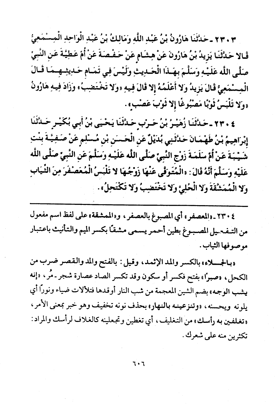2303 - حَدَّثَنَا هَارُونُ بْنُ عَبْدِ اللَّهِ، وَمَالِكُ بْنُ عَبْدِ الْوَاحِدِ الْمِسْمَعِيُّ، قَالَا: حَدَّثَنَا يَزِيدُ بْنُ هَارُونَ، عَنْ هِشَامٍ، عَنْ حَفْصَةَ، عَنْ أُمِّ عَطِيَّةَ، عَنِ النَّبِيِّ صَلَّى اللهُ عَلَيْهِ وَسَلَّمَ، بِهَذَا الْحَدِيثِ وَلَيْسَ فِي تَمَامِ حَدِيثِهِمَا. قَالَ الْمِسْمَعِيُّ: قَالَ يَزِيدُ: وَلَا أَعْلَمُهُ إِلَّا قَالَ فِيهِ: «وَلَا تَخْتَضِبُ»، وَزَادَ فِيهِ هَارُونُ، «وَلَا تَلْبَسُ ثَوْبًا مَصْبُوغًا، إِلَّا ثَوْبَ عَصْبٍ».