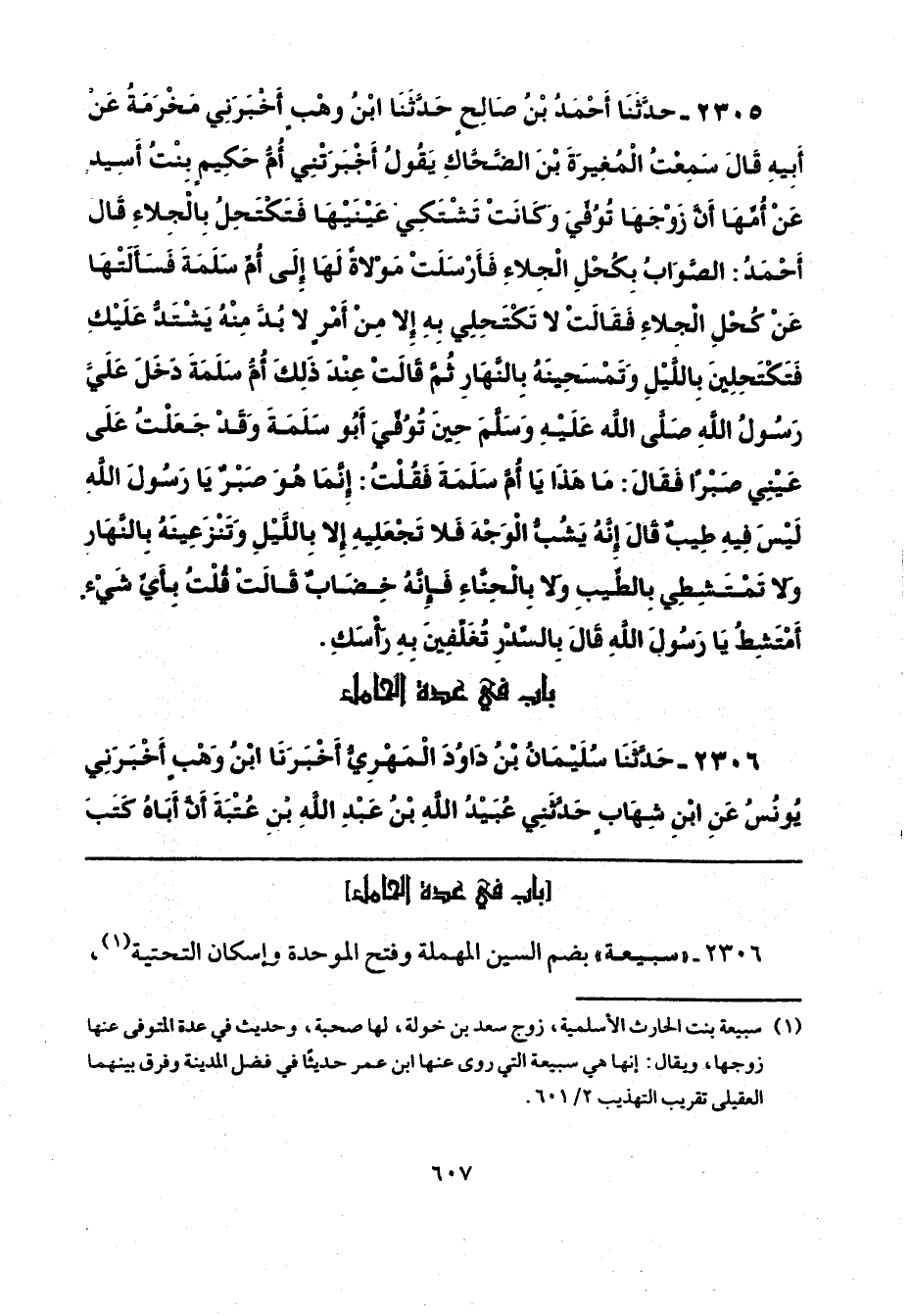 2305 - حَدَّثَنَا أَحْمَدُ بْنُ صَالِحٍ، حَدَّثَنَا ابْنُ وَهْبٍ، أَخْبَرَنِي مَخْرَمَةُ، عَنْ أَبِيهِ، قَالَ: سَمِعْتُ الْمُغِيرَةَ بْنَ الضَّحَّاكِ، يَقُولُ: أَخْبَرَتْنِي أُمُّ حَكِيمٍ بِنْتُ أَسِيدٍ، عَنْ أُمِّهَا، أَنَّ زَوْجَهَا، تُوُفِّيَ وَكَانَتْ تَشْتَكِي عَيْنَيْهَا فَتَكْتَحِلُ بِالْجِلَاءِ، - قَالَ أَحْمَدُ: الصَّوَابُ بِكُحْلِ الْجِلَاءِ - فَأَرْسَلَتْ مَوْلَاةً لَهَا إِلَى أُمِّ سَلَمَةَ، فَسَأَلَتْهَا عَنْ كُحْلِ الْجِلَاءِ؟ ، فَقَالَتْ: لَا تَكْتَحِلِي بِهِ إِلَّا مِنْ أَمْرٍ لَا بُدَّ مِنْهُ يَشْتَدُّ عَلَيْكِ، فَتَكْتَحِلِينَ بِاللَّيْلِ، وَتَمْسَحِينَهُ بِالنَّهَارِ، ثُمَّ قَالَتْ عِنْدَ ذَلِكَ أُمُّ سَلَمَةَ: دَخَلَ عَلَيَّ رَسُولُ اللَّهِ صَلَّى اللهُ عَلَيْهِ وَسَلَّمَ حِينَ تُوُفِّيَ أَبُو سَلَمَةَ، وَقَدْ جَعَلْتُ عَلَى عَيْنِي صَبْرًا، فَقَالَ: «مَا هَذَا يَا أُمَّ سَلَمَةَ؟ » فَقُلْتُ: إِنَّمَا هُوَ صَبْرٌ يَا رَسُولَ اللَّهِ، لَيْسَ فِيهِ طِيبٌ، قَالَ: «إِنَّهُ يَشُبُّ الْوَجْهَ فَلَا تَجْعَلِيهِ إِلَّا بِاللَّيْلِ، وَتَنْزَعِينَهُ بِالنَّهَارِ، وَلَا تَمْتَشِطِي بِالطِّيبِ وَلَا بِالْحِنَّاءِ، فَإِنَّهُ خِضَابٌ»، قَالَتْ: قُلْتُ: بِأَيِّ شَيْءٍ أَمْتَشِطُ يَا رَسُولَ اللَّهِ؟ قَالَ: «بِالسِّدْرِ تُغَلِّفِينَ بِهِ رَأْسَكِ».