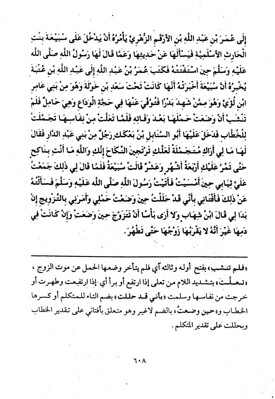 إِلَى عُمَرَ بْنِ عَبْدِ اللَّهِ بْنِ الْأَرْقَمِ الزُّهْرِيِّ، يَأْمُرُهُ أَنْ يَدْخُلَ عَلَى سُبَيْعَةَ بِنْتِ الْحَارِثِ الْأَسْلَمِيَّةِ، فَيَسْأَلَهَا، عَنْ حَدِيثِهَا، وَعَمَّا قَالَ لَهَا: رَسُولُ اللَّهِ صَلَّى اللهُ عَلَيْهِ وَسَلَّمَ حِينَ اسْتَفْتَتْهُ، فَكَتَبَ عُمَرُ بْنُ عَبْدِ اللَّهِ، إِلَى عَبْدِ اللَّهِ بْنِ عُتْبَةَ، يُخْبِرُهُ أَنَّ سُبَيْعَةَ أَخْبَرَتْهُ، أَنَّهَا كَانَتْ تَحْتَ سَعْدِ بْنِ خَوْلَةَ، وَهُوَ مِنْ بَنِي عَامِرِ بْنِ لُؤَيٍّ، وَهُوَ مِمَّنْ شَهِدَ بَدْرًا، فَتُوُفِّيَ عَنْهَا فِي حَجَّةِ الْوَدَاعِ، وَهِيَ حَامِلٌ، فَلَمْ تَنْشَبْ أَنْ وَضَعَتْ حَمْلَهَا بَعْدَ وَفَاتِهِ، فَلَمَّا تَعَلَّتْ مِنْ نِفَاسِهَا تَجَمَّلَتْ لِلْخُطَّابِ، فَدَخَلَ عَلَيْهَا أَبُو السَّنَابِلِ بْنُ بَعْكَكٍ رَجُلٌ مِنْ بَنِي عَبْدِ الدَّارِ، فَقَالَ لَهَا: مَا لِي أَرَاكِ مُتَجَمِّلَةً لَعَلَّكِ تَرْتَجِينَ النِّكَاحَ؟ إِنَّكِ وَاللَّهِ مَا أَنْتِ بِنَاكِحٍ حَتَّى تَمُرَّ عَلَيْكِ أَرْبَعَةُ أَشْهُرٍ وَعَشْرٌ، قَالَتْ سُبَيْعَةُ: فَلَمَّا قَالَ لِي ذَلِكَ، جَمَعْتُ عَلَيَّ ثِيَابِي حِينَ أَمْسَيْتُ، فَأَتَيْتُ رَسُولَ اللَّهِ صَلَّى اللهُ عَلَيْهِ وَسَلَّمَ، فَسَأَلْتُهُ عَنْ ذَلِكَ، فَأَفْتَانِي بِأَنِّي «قَدْ حَلَلْتُ حِينَ وَضَعْتُ حَمْلِي، وَأَمَرَنِي بِالتَّزْوِيجِ، إِنْ بَدَا لِي»، قَالَ ابْنُ شِهَابٍ: «وَلَا أَرَى بَأْسًا أَنْ تَتَزَوَّجَ حِينَ وَضَعَتْ، وَإِنْ كَانَتْ فِي دَمِهَا غَيْرَ أَنَّهُ لَا يَقْرَبُهَا زَوْجُهَا حَتَّى تَطْهُرَ».