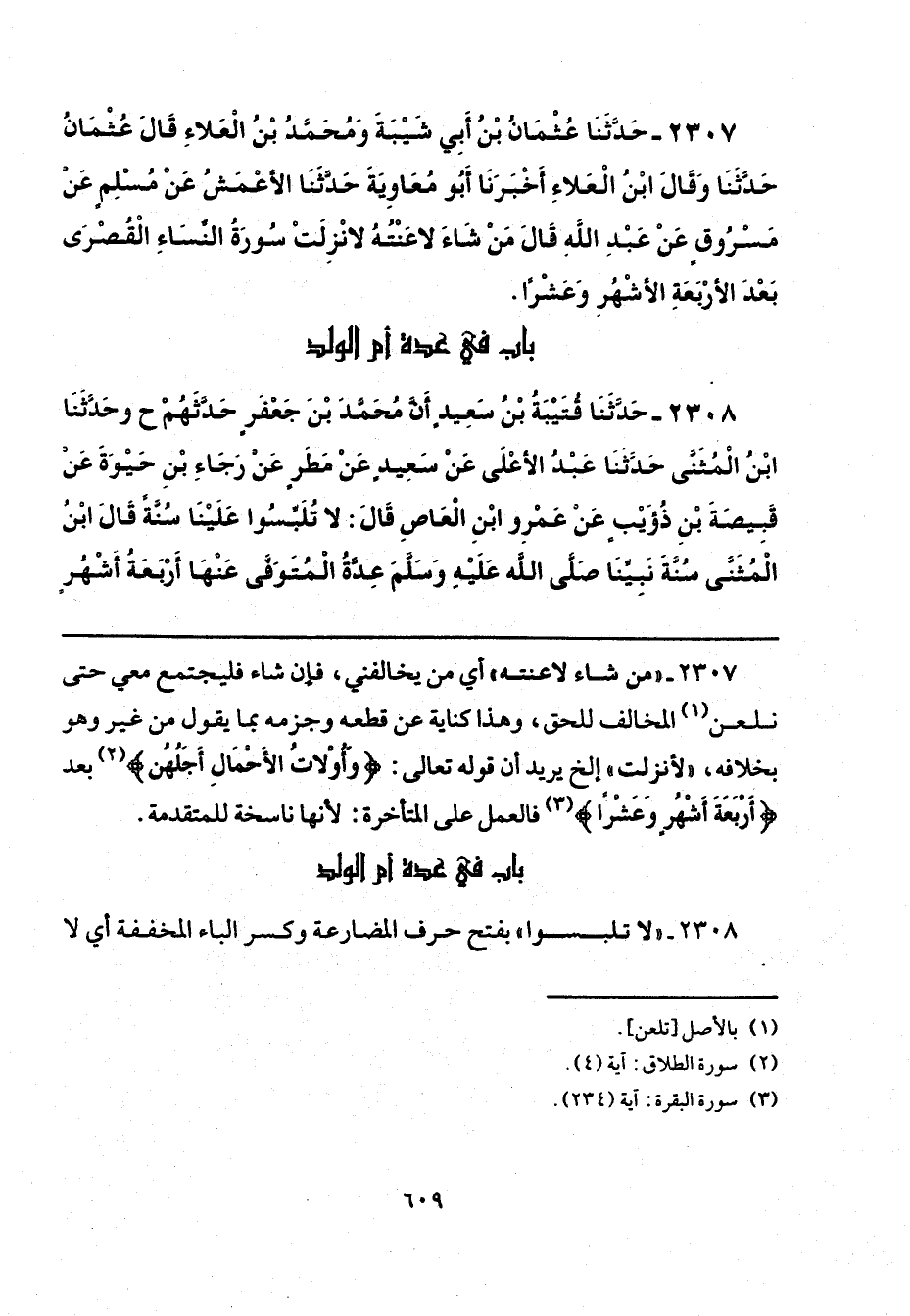 2307 - حَدَّثَنَا عُثْمَانُ بْنُ أَبِي شَيْبَةَ، وَمُحَمَّدُ بْنُ الْعَلَاءِ، قَالَ عُثْمَانُ: حَدَّثَنَا، وَقَالَ ابْنُ الْعَلَاءِ: أَخْبَرَنَا أَبُو مُعَاوِيَةَ، حَدَّثَنَا الْأَعْمَشُ، عَنْ مُسْلِمٍ، عَنْ مَسْرُوقٍ، عَنْ عَبْدِ اللَّهِ قَالَ: «مَنْ شَاءَ لَاعَنْتُهُ لَأُنْزِلَتْ سُورَةُ النِّسَاءِ الْقُصْرَى بَعْدَ الْأَرْبَعَةِ الْأَشْهُرِ وَعَشْرًا».